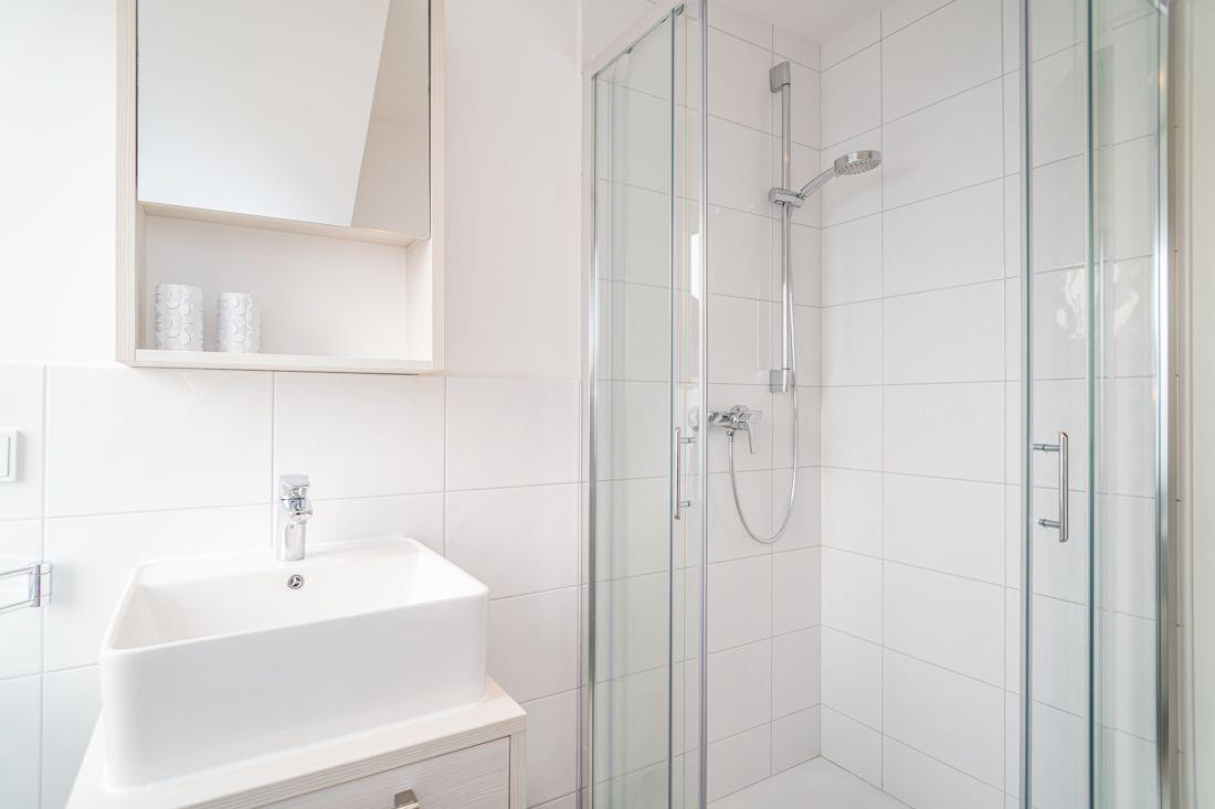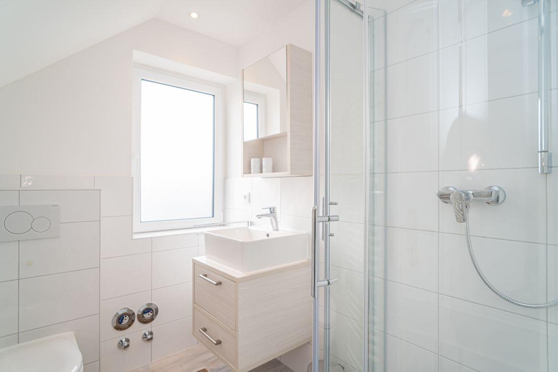 Frisch renoviertes Duschbad mit WC.