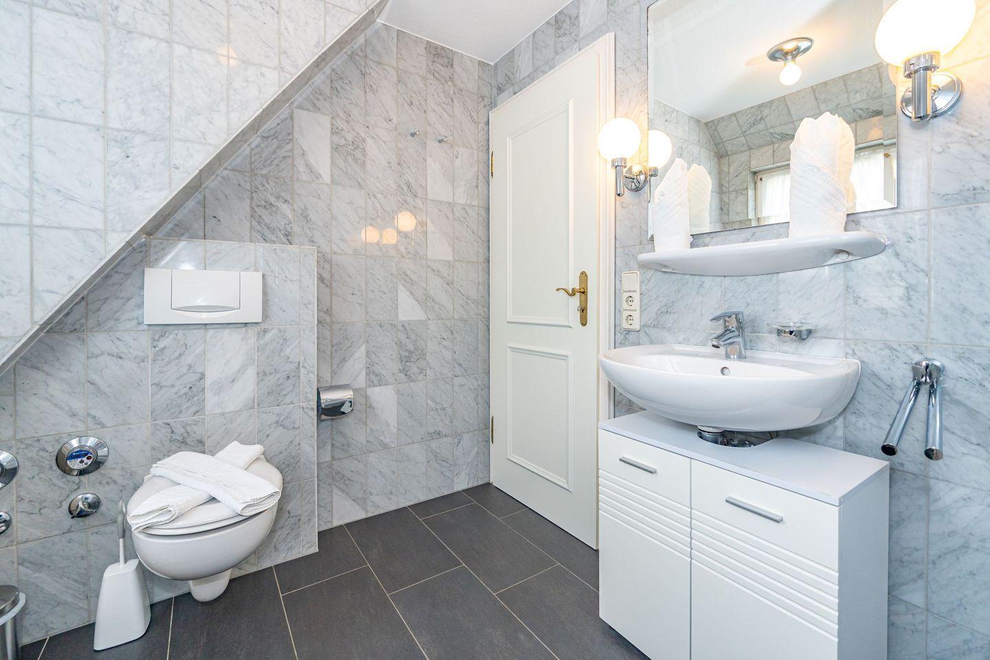 Das große Schlafzimmer hat ein Doppelbett (2 x 90 cm Breite), Einbauschänke sowie ein Kabel-Flachbild TV und Schreibtisch. Im kleineren Schlafzimmer ist ein Boxspringbett sowie ein Einbauschrank. Das Badezimmer mit Dusche, WC und Waschbecken hat Fußbodenheizung.