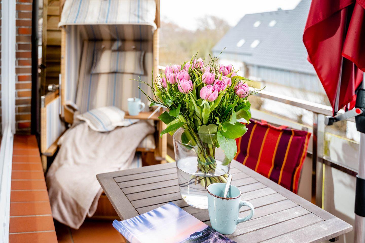 Für einen gemütlichen Tagesausklang laden die Südbalkone mit einem kleinen Strandkorb, einem Tisch mit zwei Stühlen aus Holz sowie ein Sonnenschirm ein.