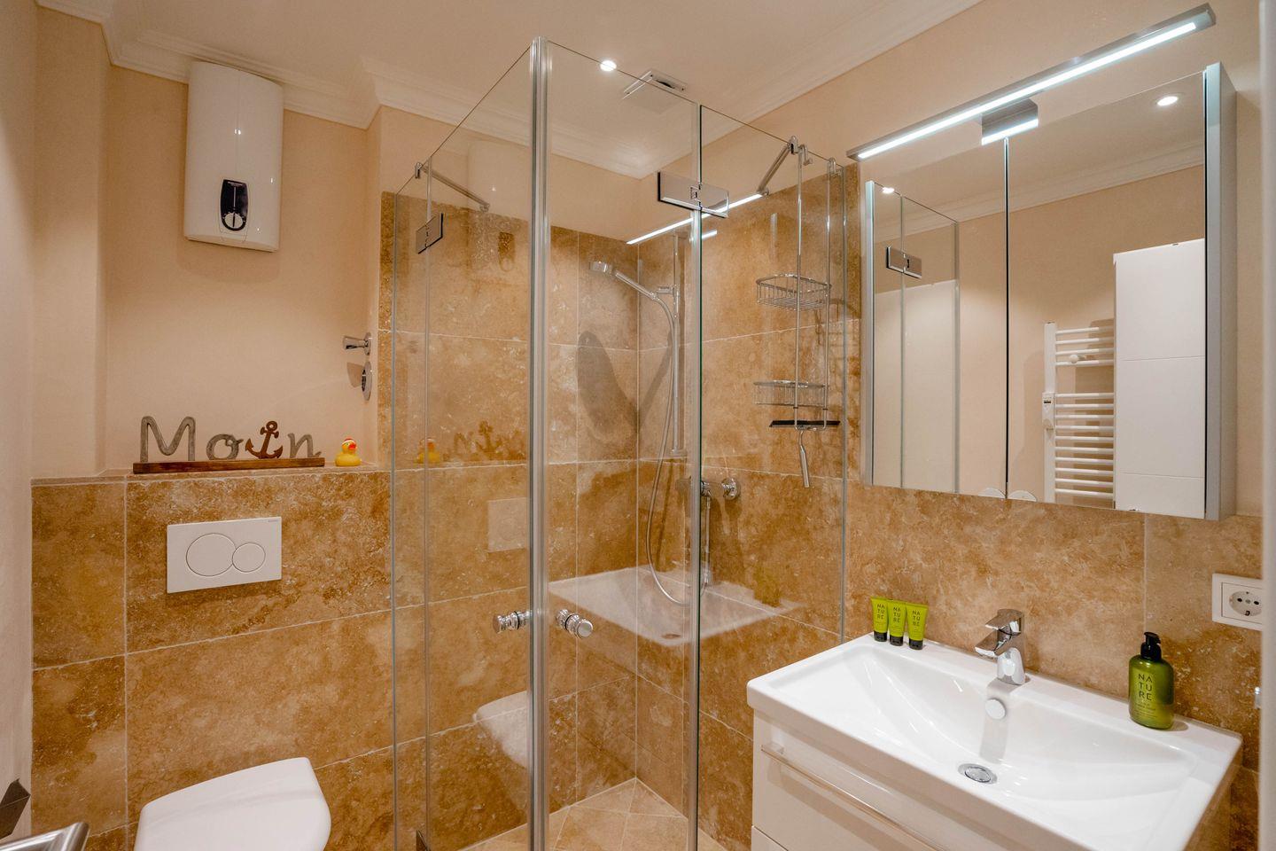 Im Bad befindet sich eine bodenebene Dusche, Waschtisch und WC sowie ein Handtuchheizkörper.