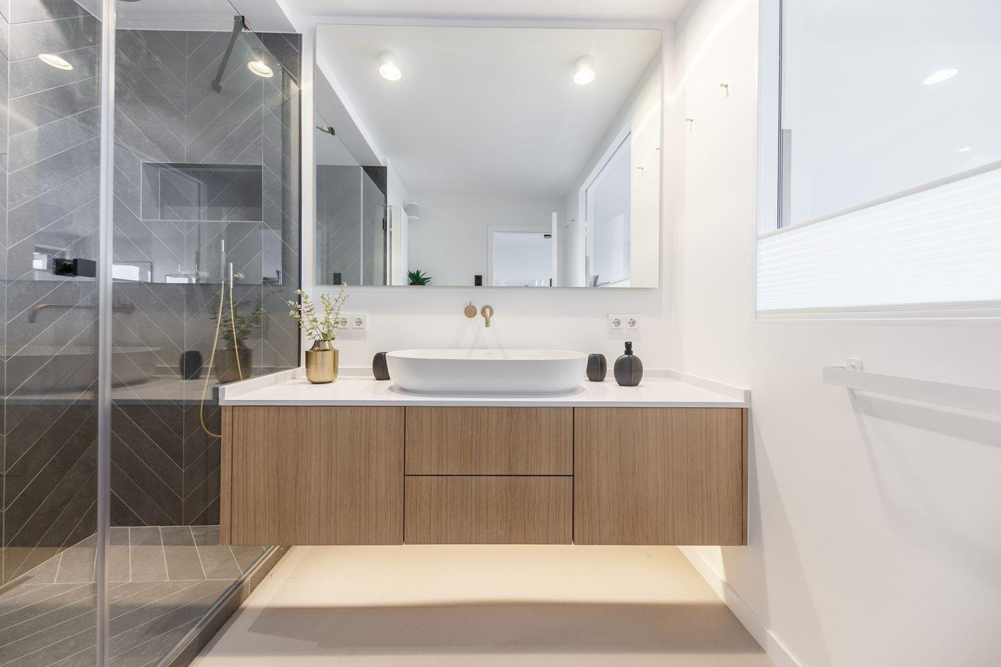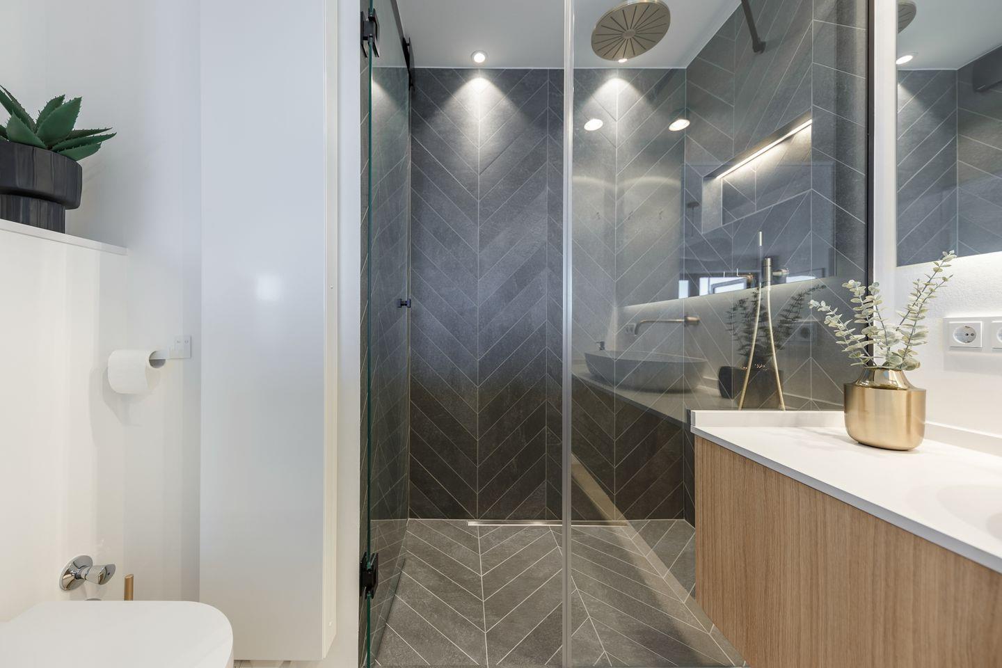 Apropos Bad: Die große Walk-in Dusche ist in edlem Anthrazit gehalten und wird von Armaturen aus Messing gekrönt. Perfekt, um sich nach dem Bad im Meer eine kleine Spa-Auszeit zu gönnen. Anschließend ein Sun-downer auf dem Balkon mit dem Gedanken: Life is better at the beach!