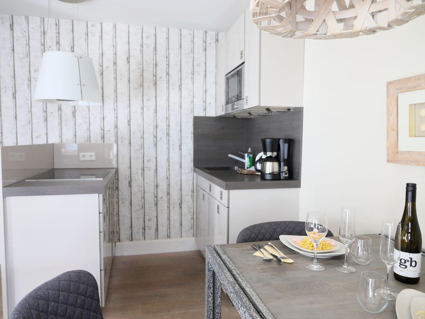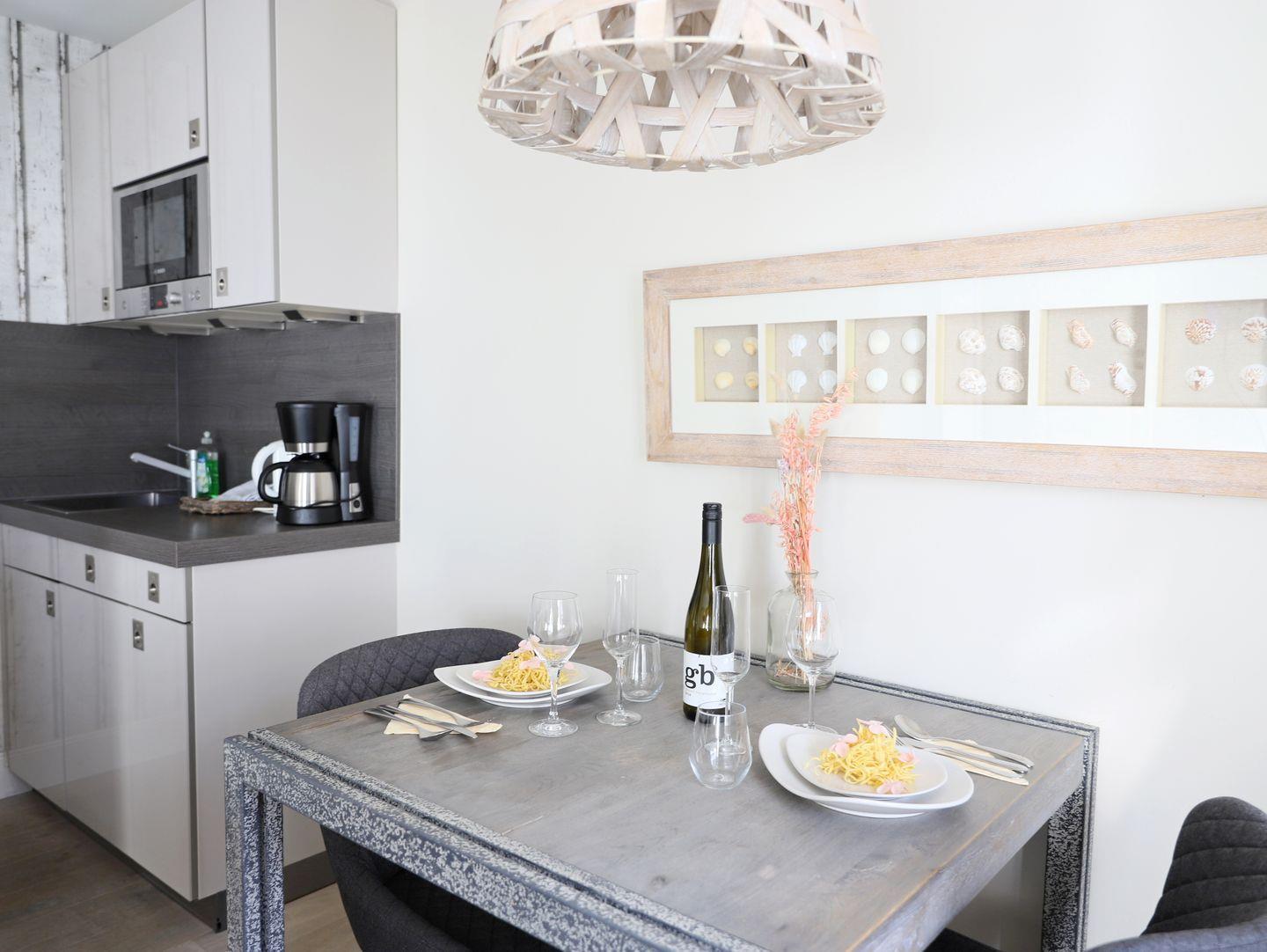 Diese hochwertig ausgestattete 2-Zimmer-Wohnung in Wenningstedt bietet auf 44 m² Platz für bis zu drei Personen und kombiniert stilvolles Design mit einer exzellenten Lage. Der helle Wohnbereich verfügt über ein Schlafsofa (150x200 cm) und Kabel-TV. Das Schlafzimmer bietet mit einem gemütlichen Doppelbett (160x200 cm) und Kabel-TV zusätzlichen Komfort. Die moderne Küche im Wohnbereich ist ideal für alle, die auch im Urlaub kochen möchten. Das Badezimmer bietet eine Dusche, und im Keller stehen Münz-Waschmaschine und Trockner zur Verfügung. Ein möblierter Süd-Balkon und ein Stellplatz direkt am Haus runden das Angebot ab. Haustiere sind nicht gestattet.