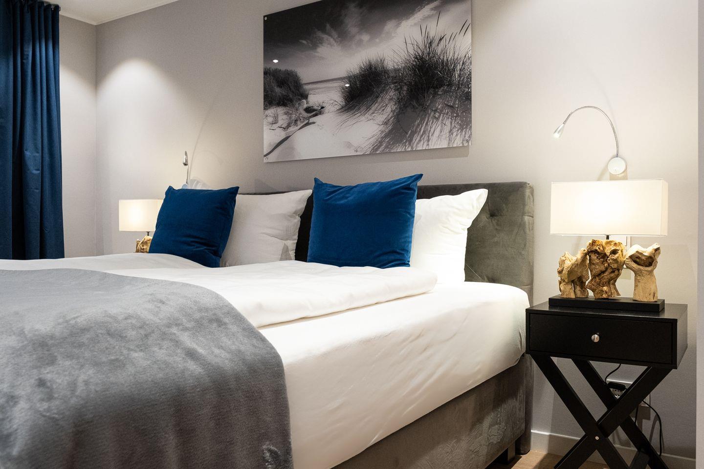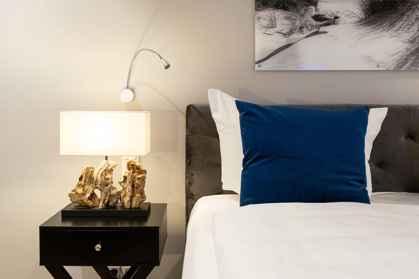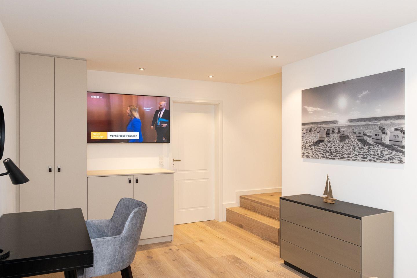 Im 1. Obergeschoss erwarten Sie zwei weitere komfortable Schlafzimmer mit Boxspringbetten und jeweils eigenem Badezimmer mit Dusche/WC. Ergänzt wird die Etage durch ein zusätzliches, kleineres Schlafzimmer mit Einzelbett, das sich besonders gut für Kinder oder eine zusätzliche Begleitperson eignet.