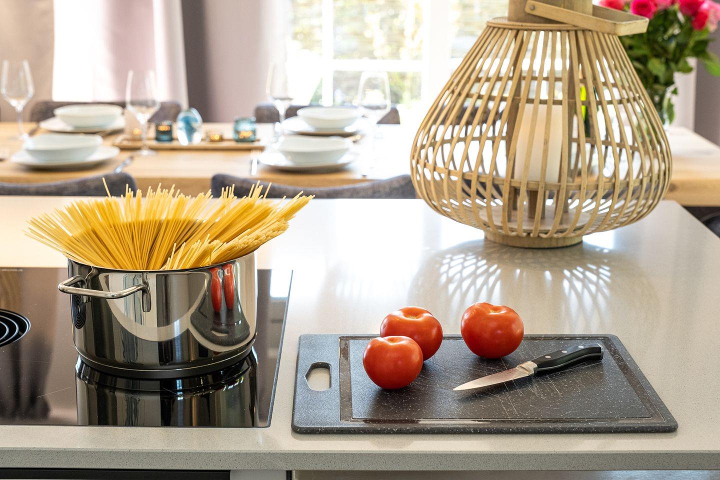 Bereits beim Betreten des Hauses empfängt Sie der großzügige, lichtdurchflutete Wohn- und Essbereich, der mit einer komfortablen Sitzecke und großem Smart-TV zum Entspannen einlädt. Der angrenzende Essbereich bietet viel Platz für gesellige Abende, während die hochwertige, offene Küche mit Kochinsel keine Wünsche offenlässt. Sie ist unter anderem mit Backofen, Mikrowelle, Geschirrspüler sowie Filter- und Nespresso-Kaffeemaschine ausgestattet und bietet ideale Voraussetzungen für gemeinsames Kochen im Urlaub.