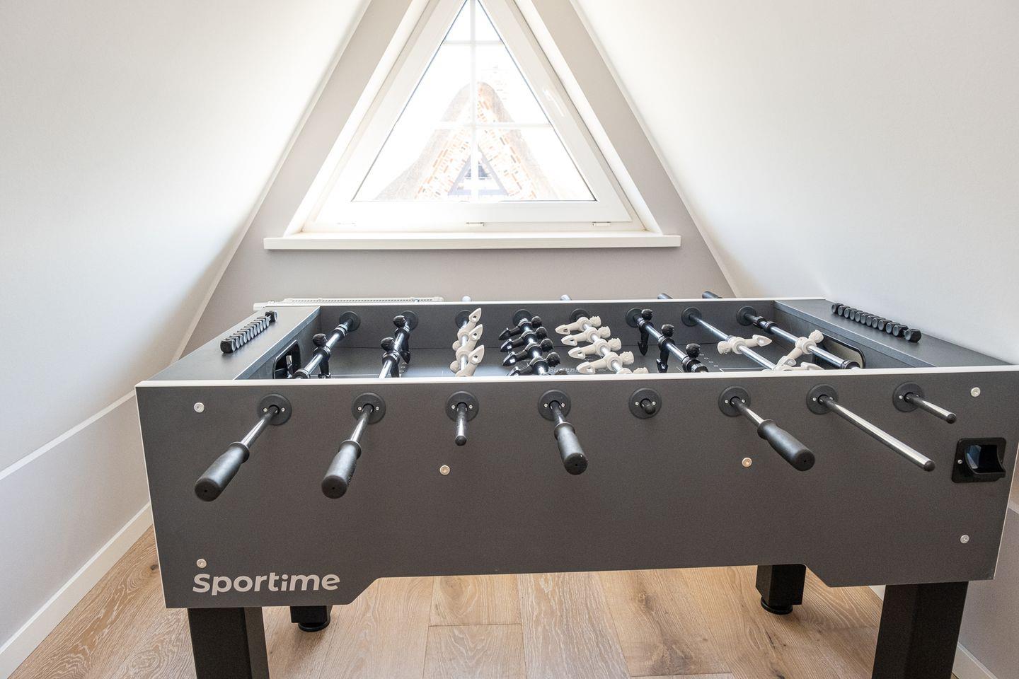 Ein weiteres charmantes Detail des Hauses befindet sich im Spitzboden des Reetdaches: Hier lädt eine gemütliche Leselounge zum Rückzug ein. Alternativ sorgt ein Tischkicker für Unterhaltung und gemeinsame Spieleabende.
