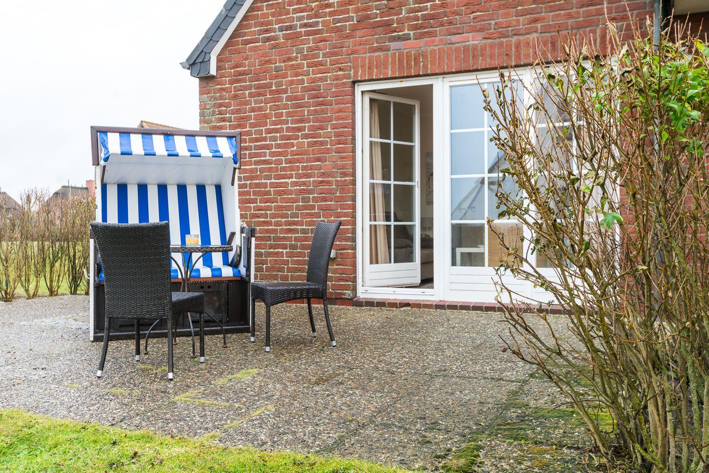 Der offene Wohn- und Essbereich bildet das Herzstück der Wohnung. Hier erwartet Sie eine gemütliche Sitzlandschaft, ein Essplatz und der direkte Zugang zur sonnigen Terrasse, auf der Sie bei gutem Wetter den Tag mit einer Tasse Kaffee beginnen oder den Abend entspannt ausklingen lassen können. Die Terrasse ist mit bequemen Gartenmöbeln und einem Strandkorb ausgestattet – ein wunderbarer Ort, um frische Nordseeluft und Inselstimmung zu genießen.