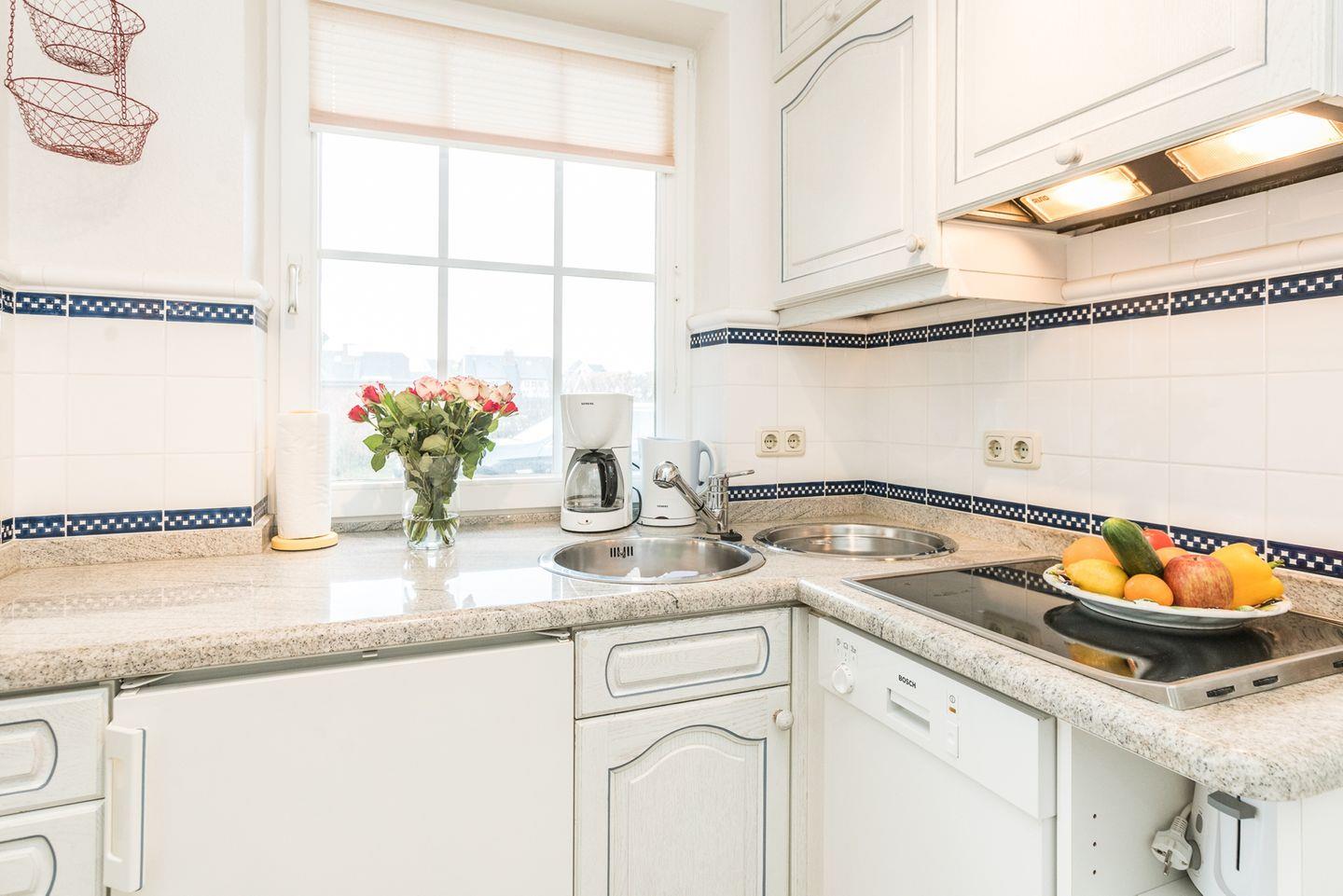 Die offene Küchenzeile ist funktional und hochwertig ausgestattet: Sie verfügt über Herd, Geschirrspüler, Mikrowelle, sowie Kaffeemaschine, Wasserkocher und Toaster – ideal für die Zubereitung kleinerer Mahlzeiten oder Ihres Frühstücks. So können Sie Ihren Aufenthalt ganz nach Ihren Vorstellungen gestalten.