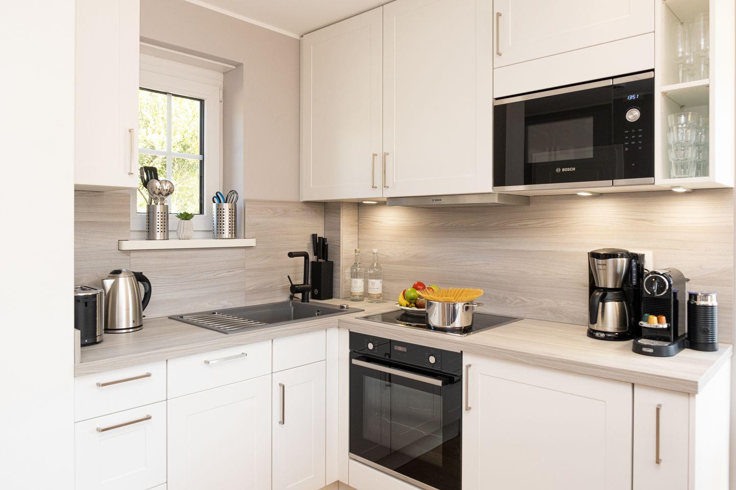 Der lichtdurchflutete Wohn- und Essbereich im Erdgeschoss bildet das Herzstück des Hauses. Eine komfortable Sitzlandschaft mit Smart-TV lädt zum Entspannen ein, während der großzügige Essplatz ideale Voraussetzungen für gesellige Mahlzeiten bietet. Die offene, moderne Küche ist vollständig ausgestattet und verfügt unter anderem über Backofen, Mikrowelle, Geschirrspüler sowie eine Filter- und Nespresso-Kaffeemaschine – perfekt für gemeinsame Kochmomente im Urlaub.