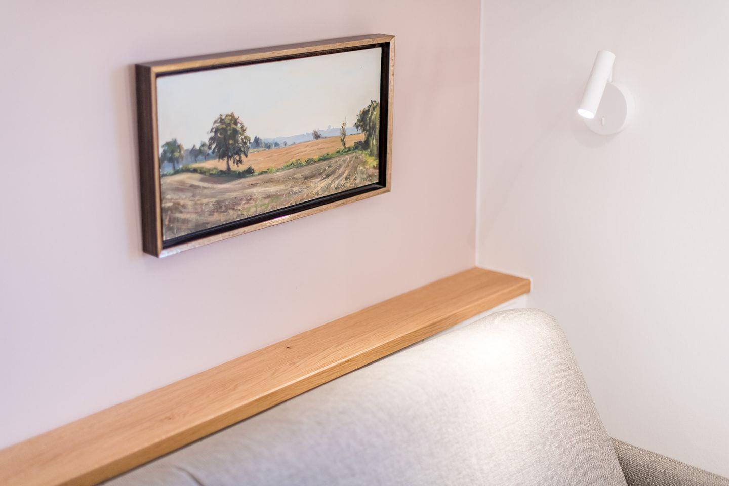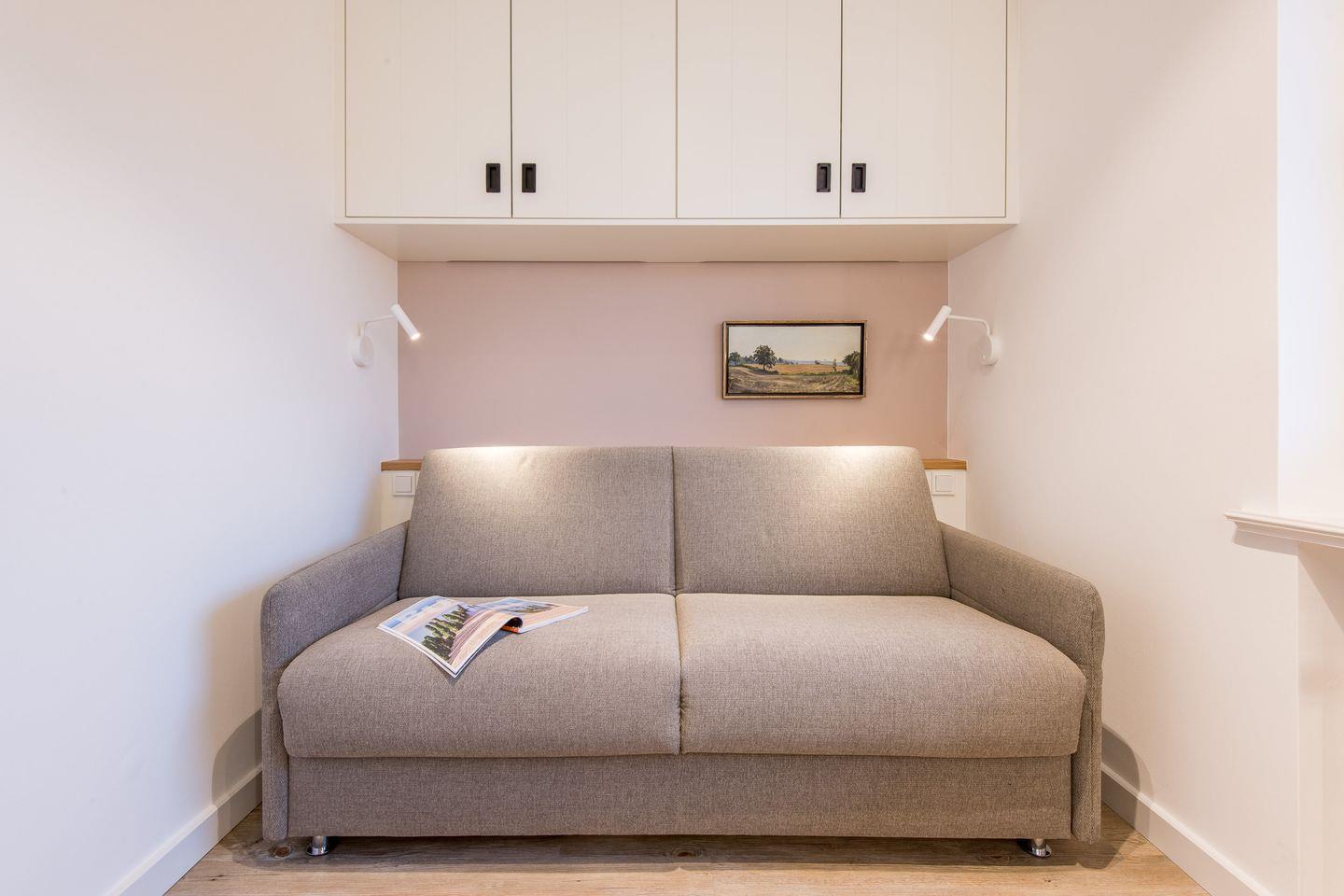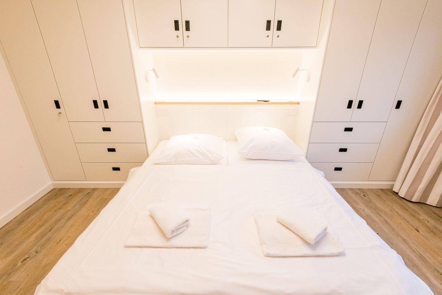 Das Hauptschlafzimmer verfügt über ein komfortables Doppelbett (2x 100x200 cm) und einen Einbauschrank. Im zweiten Schlafzimmer befindet sich ein Schlafsofa sowie ein kleines Waschbecken – ideal für zusätzliche Gäste oder Kinder.
