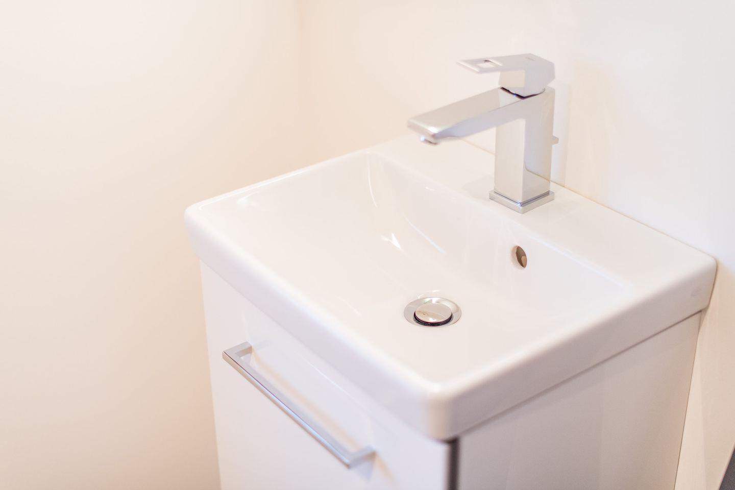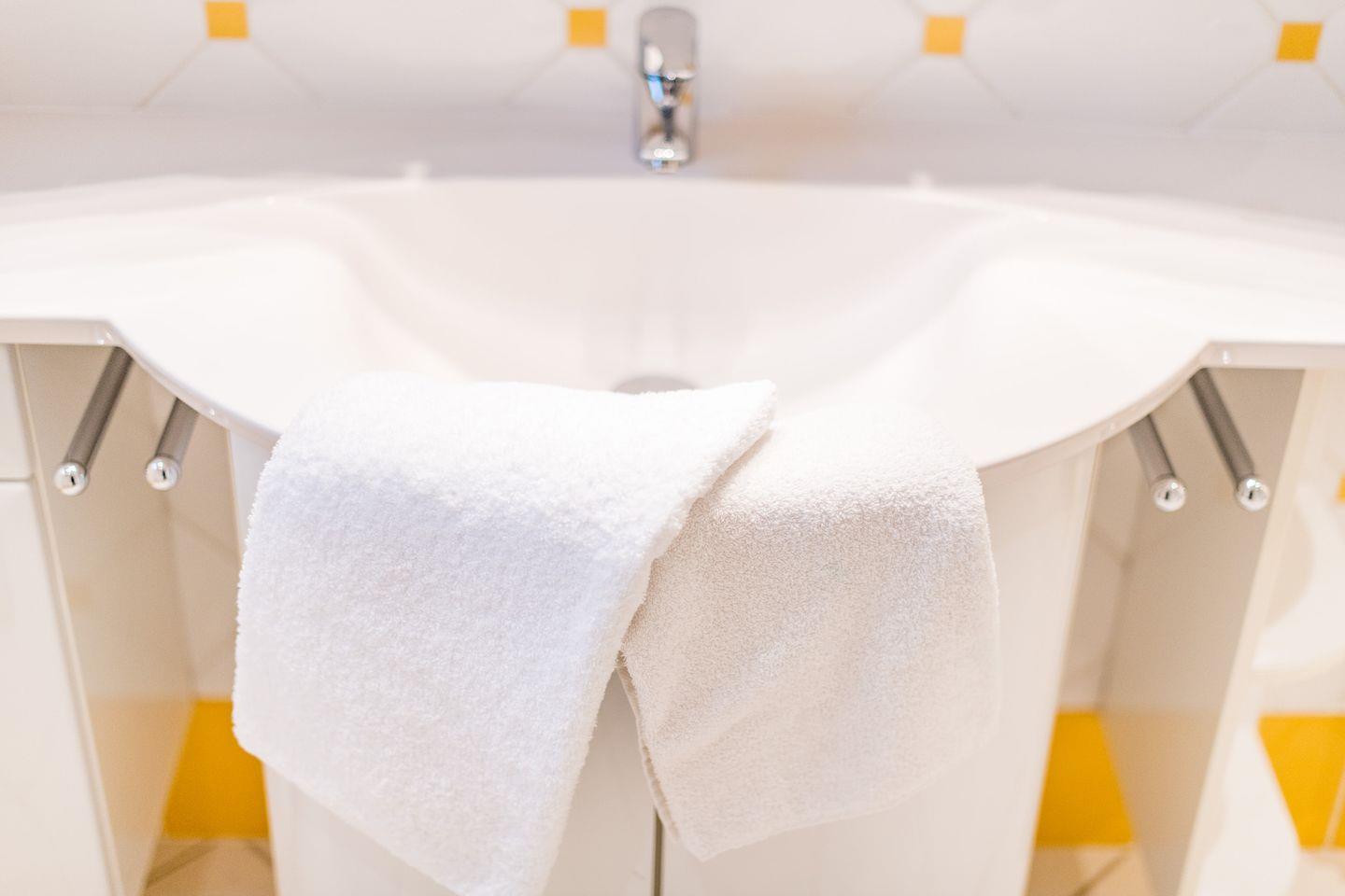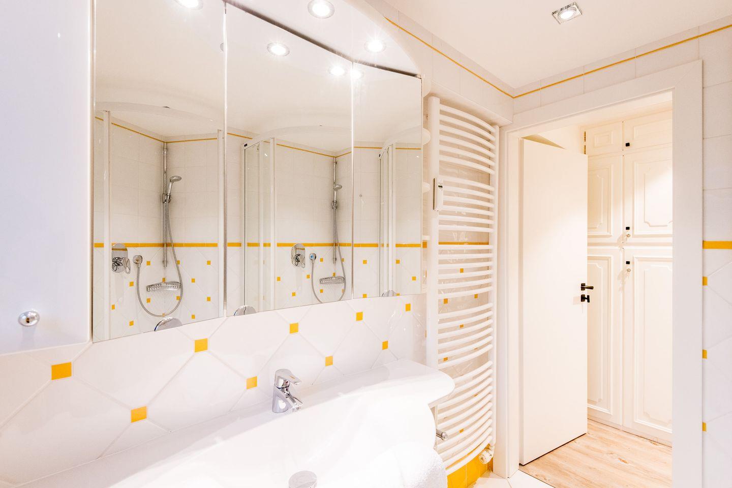 Das Badezimmer ist modern gestaltet und mit einer Dusche, einem WC, einem Handtuchwärmer, einem Föhn und Tageslicht ausgestattet.
