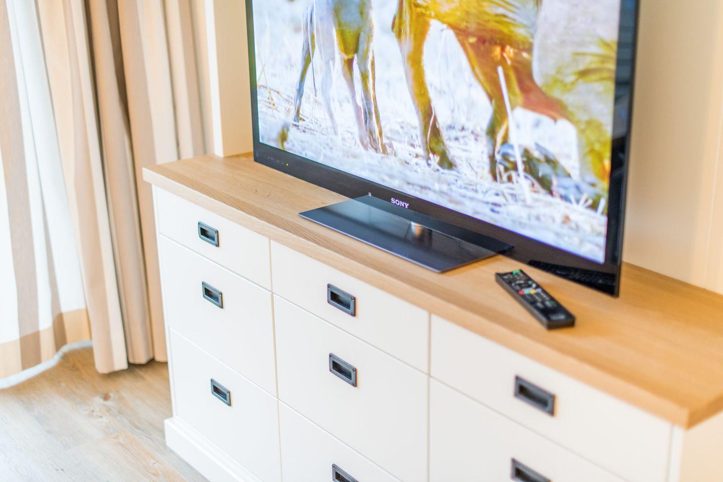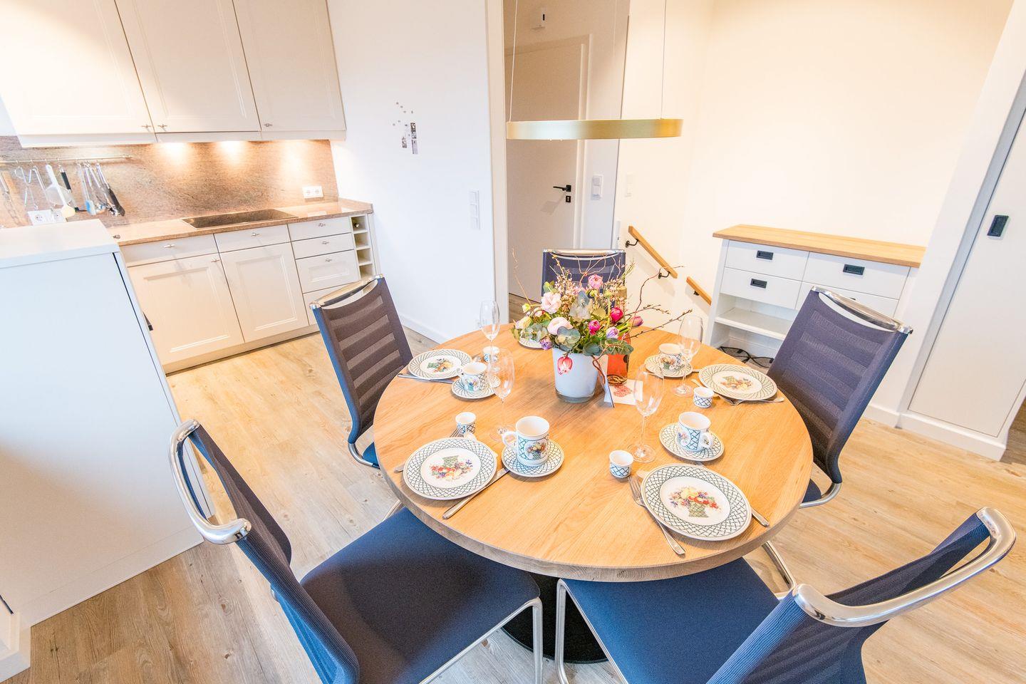 Das gemütliche Wohnzimmer ist mit einer großen Couch, einem TV, einem Blu-ray-Player und einer DVD-Sammlung ausgestattet, die für Unterhaltung sorgen. Der runde Esstisch bietet Platz für 4 Personen. Von hier aus gelangen Sie direkt auf die möblierte Terrasse nach Süden und den kleinen Garten, in dem ein Strandkorb auf Sie wartet – ideal, um sonnige Stunden zu genießen.