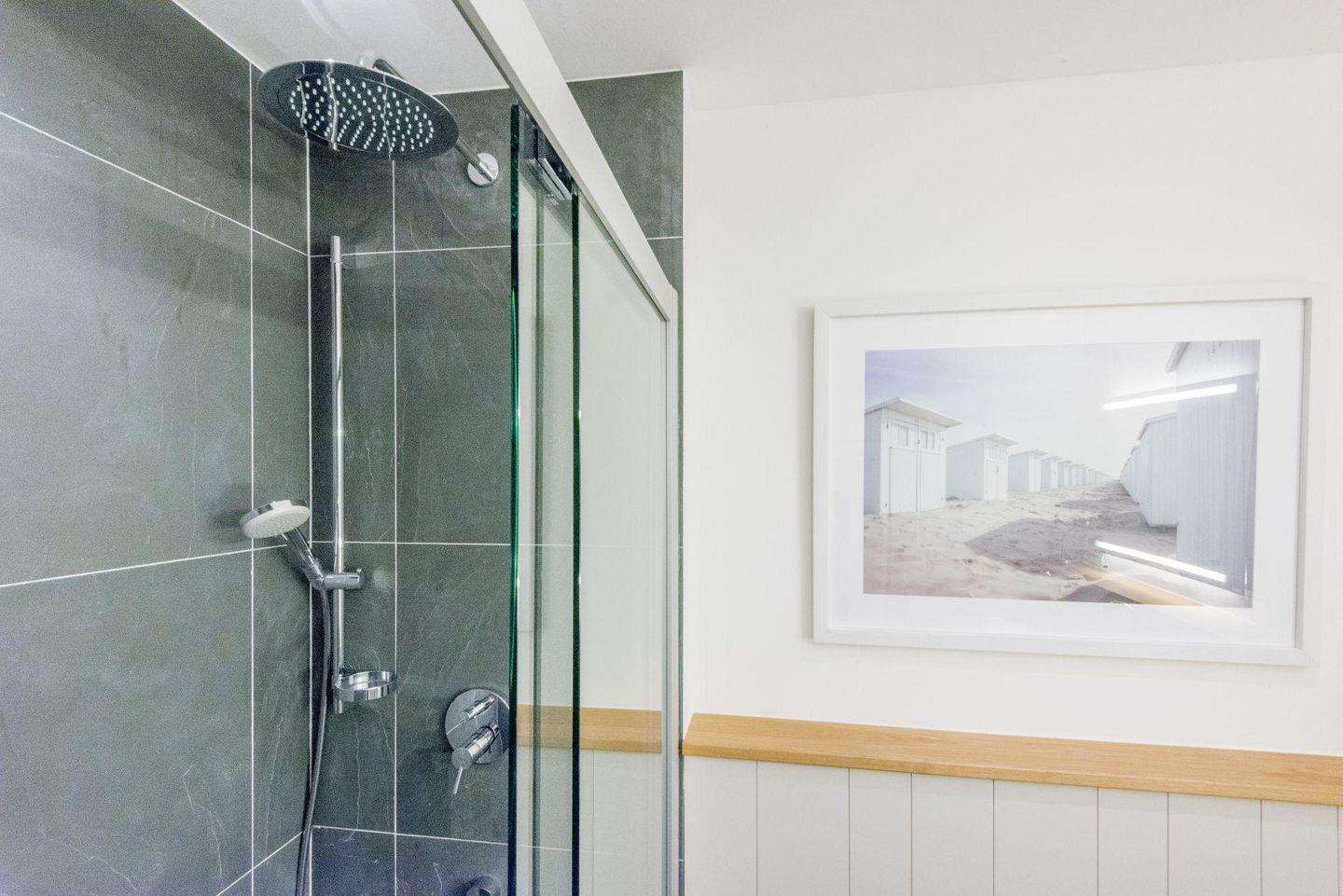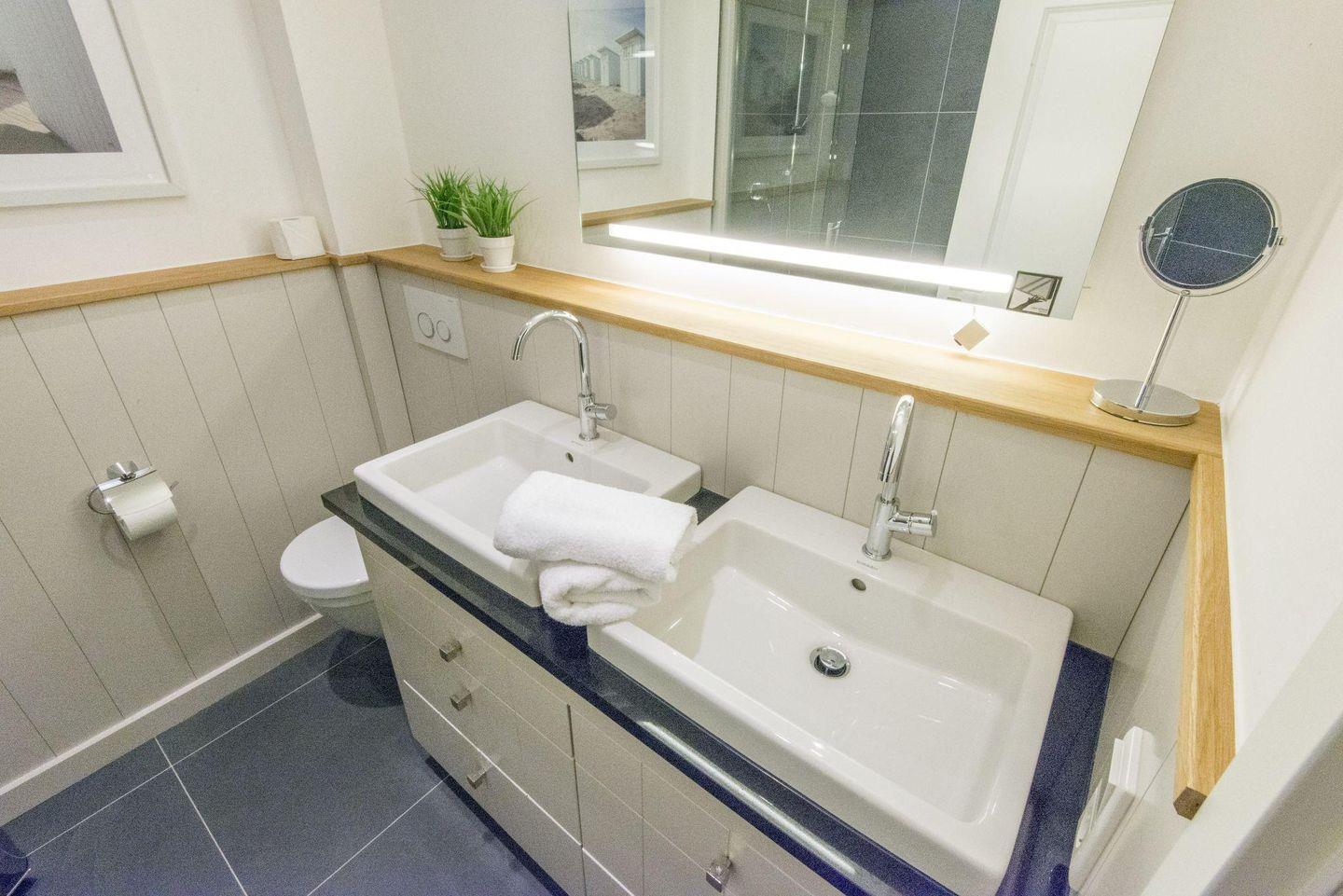 Das moderne Badezimmer ist mit einer Dusche, WC, Doppelwaschbecken, Handtuchwärmer und Föhn ausgestattet und bietet den perfekten Start in den Tag. Im gemeinschaftlichen Wellnessbereich mit Sauna und Ruheraum im Haus können Sie nach einem Strandtag wunderbar entspannen.