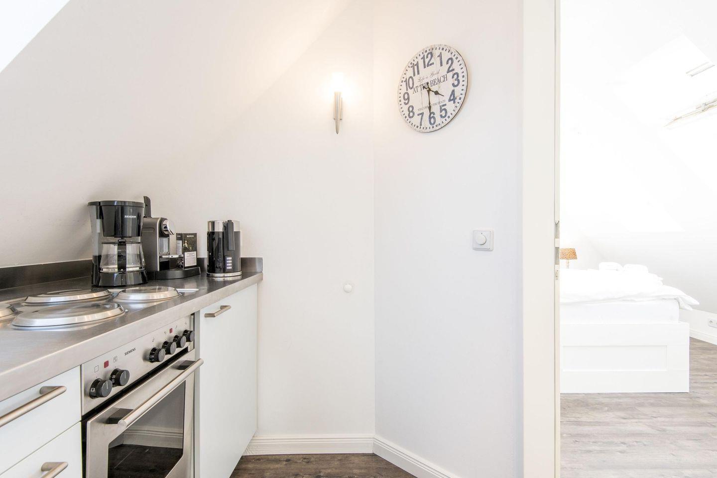 Die halboffene Pantry-Küche ist kompakt, aber funktional eingerichtet. Mit einem 4-flammigen Herd, einer Krups Nespresso-Maschine und allen notwendigen Küchenutensilien ausgestattet, bietet sie viel Komfort für die Zubereitung kleinerer Mahlzeiten. Der angrenzende Essbereich ist ideal für ein gemütliches Frühstück oder ein Abendessen zu zweit.