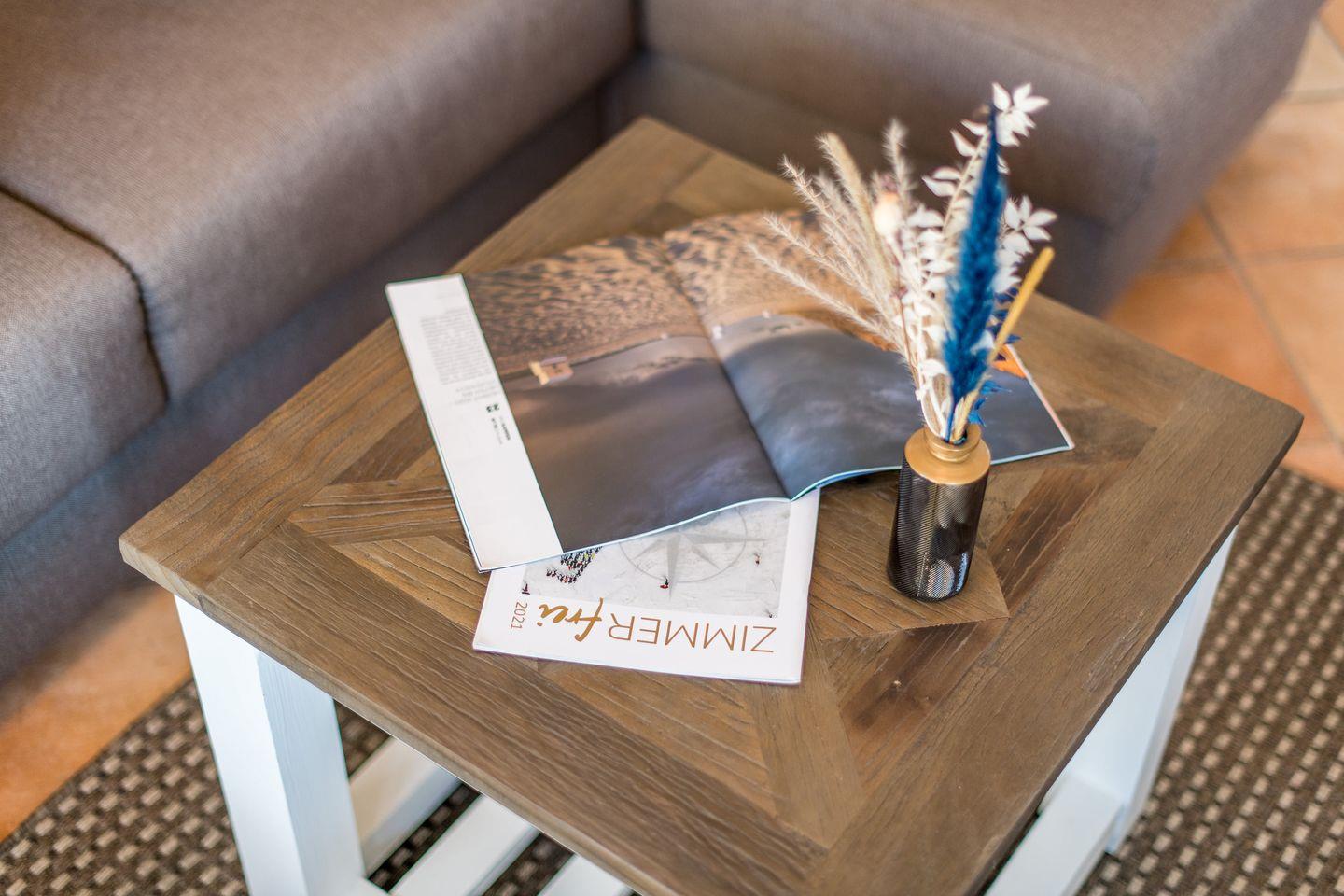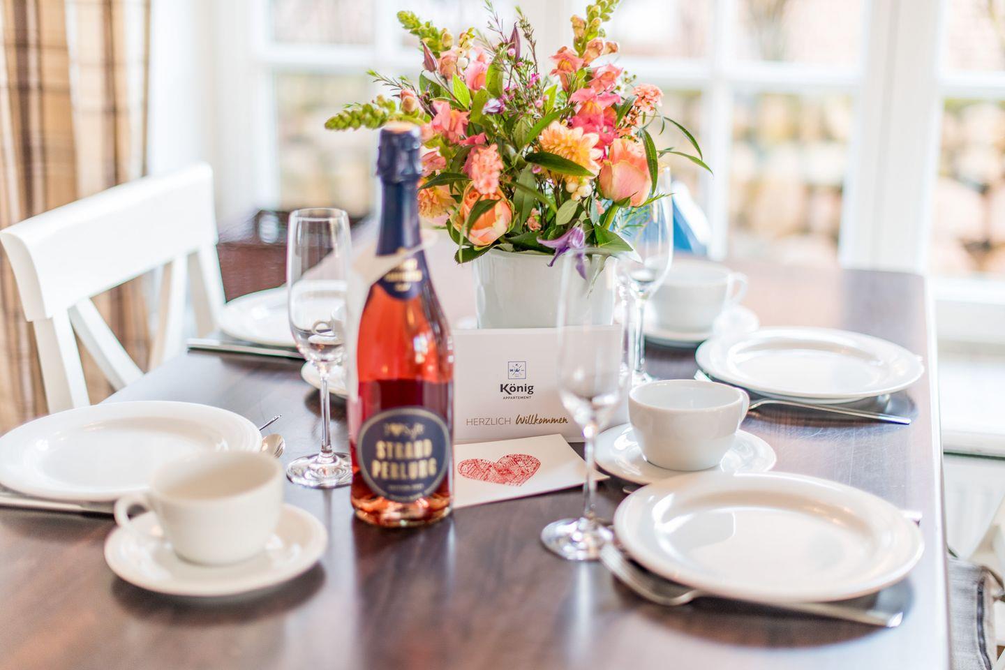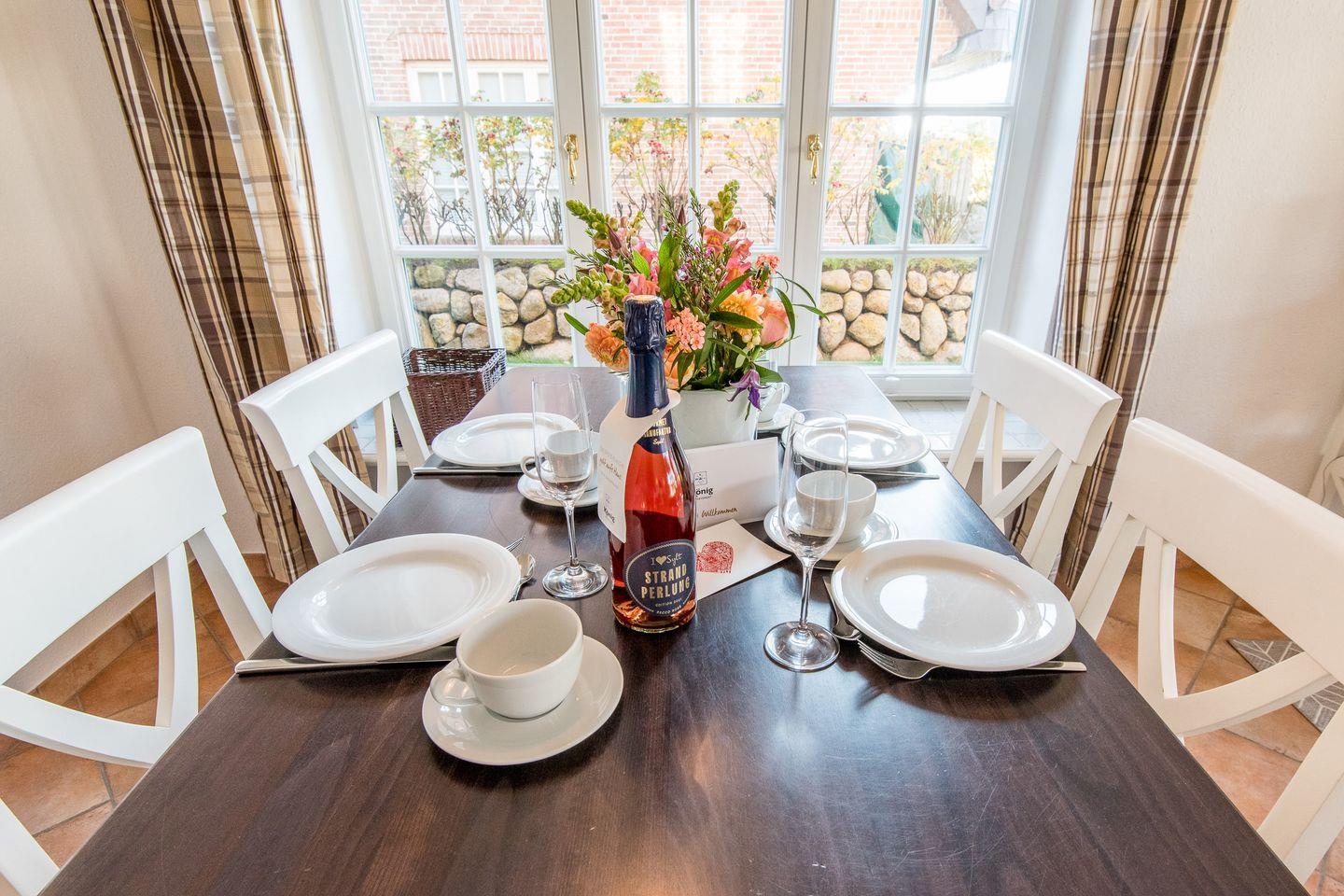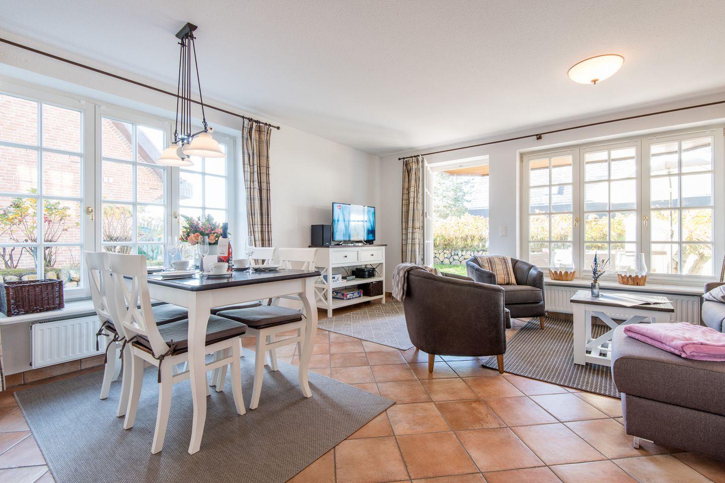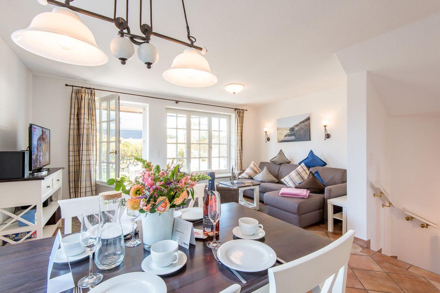 Das Wohnzimmer besticht durch sein gemütliches Ambiente und verfügt über ein komfortables Sofa, zwei Korbsessel und ein TV, sodass entspannte Abende garantiert sind. Der Essbereich bietet Platz für 4 Personen und ist ideal für gemeinsame Mahlzeiten. Von hier aus gelangen Sie direkt zur sonnigen West-Terrasse, die mit Gartenmöbeln und einem Strandkorb ausgestattet ist – ein traumhafter Ort, um die Sonne zu genießen und zur Ruhe zu kommen.