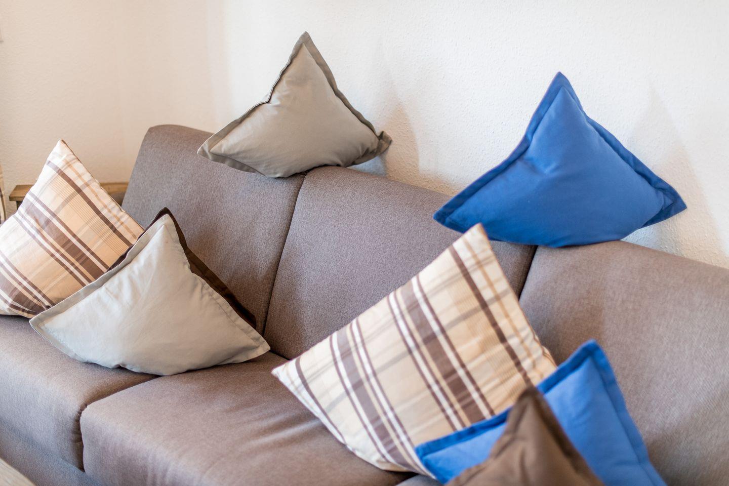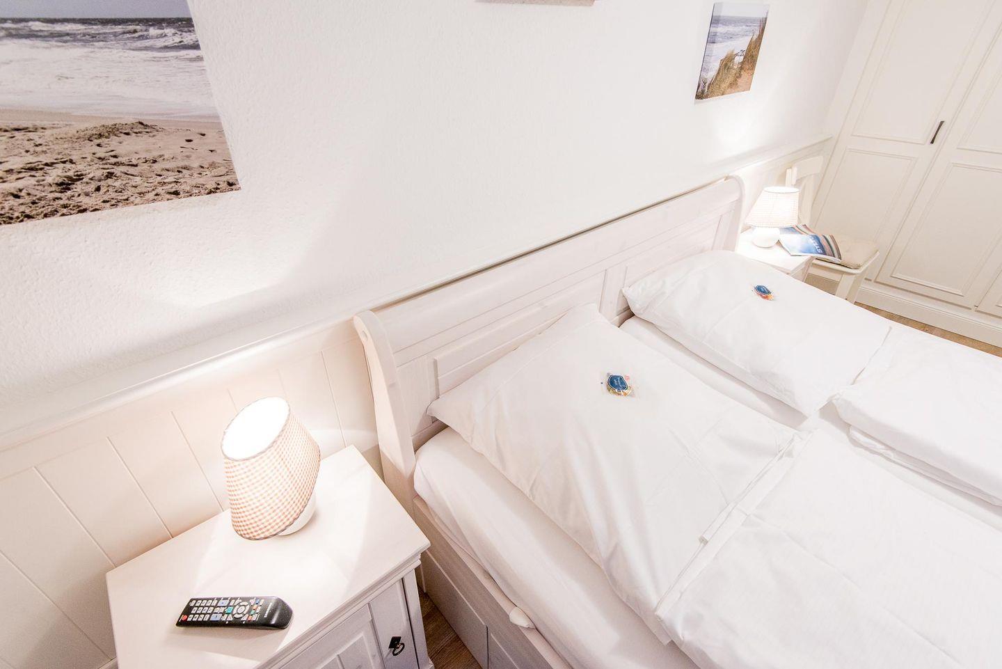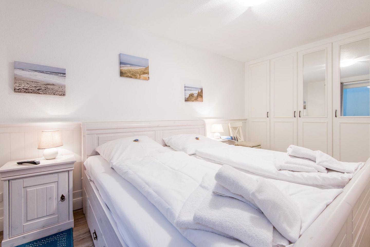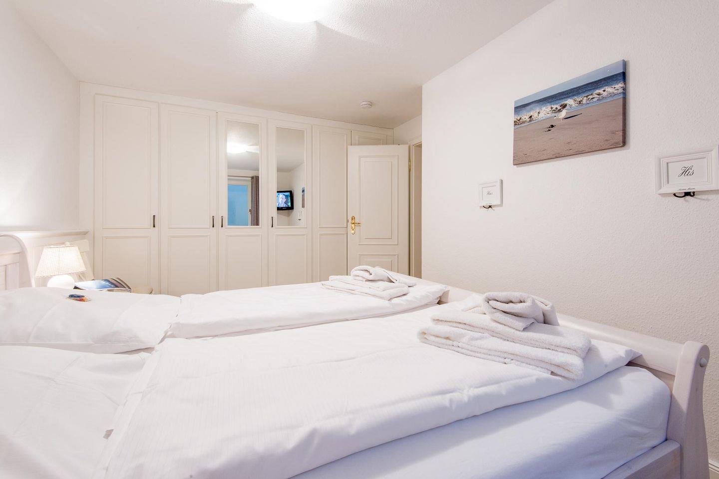 Die beiden Schlafzimmer im Untergeschoss der Wohnung sind stilvoll und komfortabel eingerichtet und bieten Ihnen eine perfekte Rückzugsmöglichkeit für erholsame Nächte. Das erste Schlafzimmer ist mit einem großzügigen Doppelbett (2x 90x200 cm) ausgestattet und verfügt über einen begehbaren Kleiderschrank sowie ein eigenes TV – ideal, um den Tag entspannt ausklingen zu lassen. Im zweiten Schlafzimmer erwartet Sie ebenfalls ein komfortables Doppelbett (2x 90x200 cm), ein Einbauschrank, ein TV und ein gemütlicher Stuhl, der eine kleine Leseecke schafft. Beide Räume sind mit viel Liebe zum Detail gestaltet und bieten dank ihrer Ausstattung höchsten Schlafkomfort, damit Sie die Ruhe und Entspannung Ihres Urlaubs in vollen Zügen genießen können.