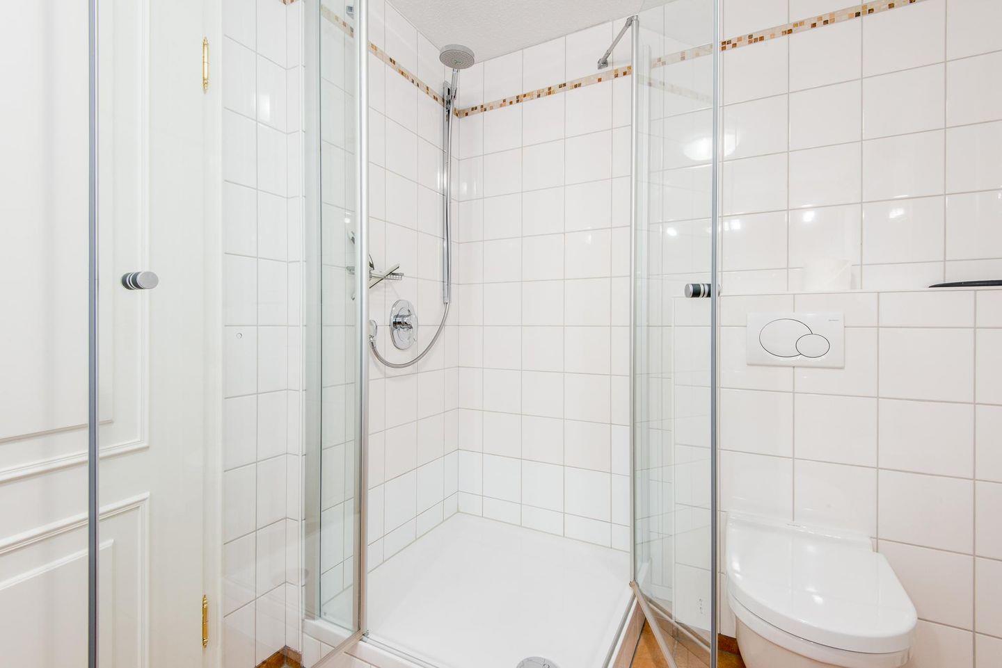 Die Wohnung verfügt über ein stilvolles Duschbad mit Tageslicht, WC, Fön und Handtuchwärmer. Direkt angrenzend befindet sich ein Waschraum mit Waschmaschine und Trockner sowie eine kleine Abstellkammer für zusätzlichen Stauraum. Ein Gäste-WC im Eingangsbereich rundet den Komfort ab.