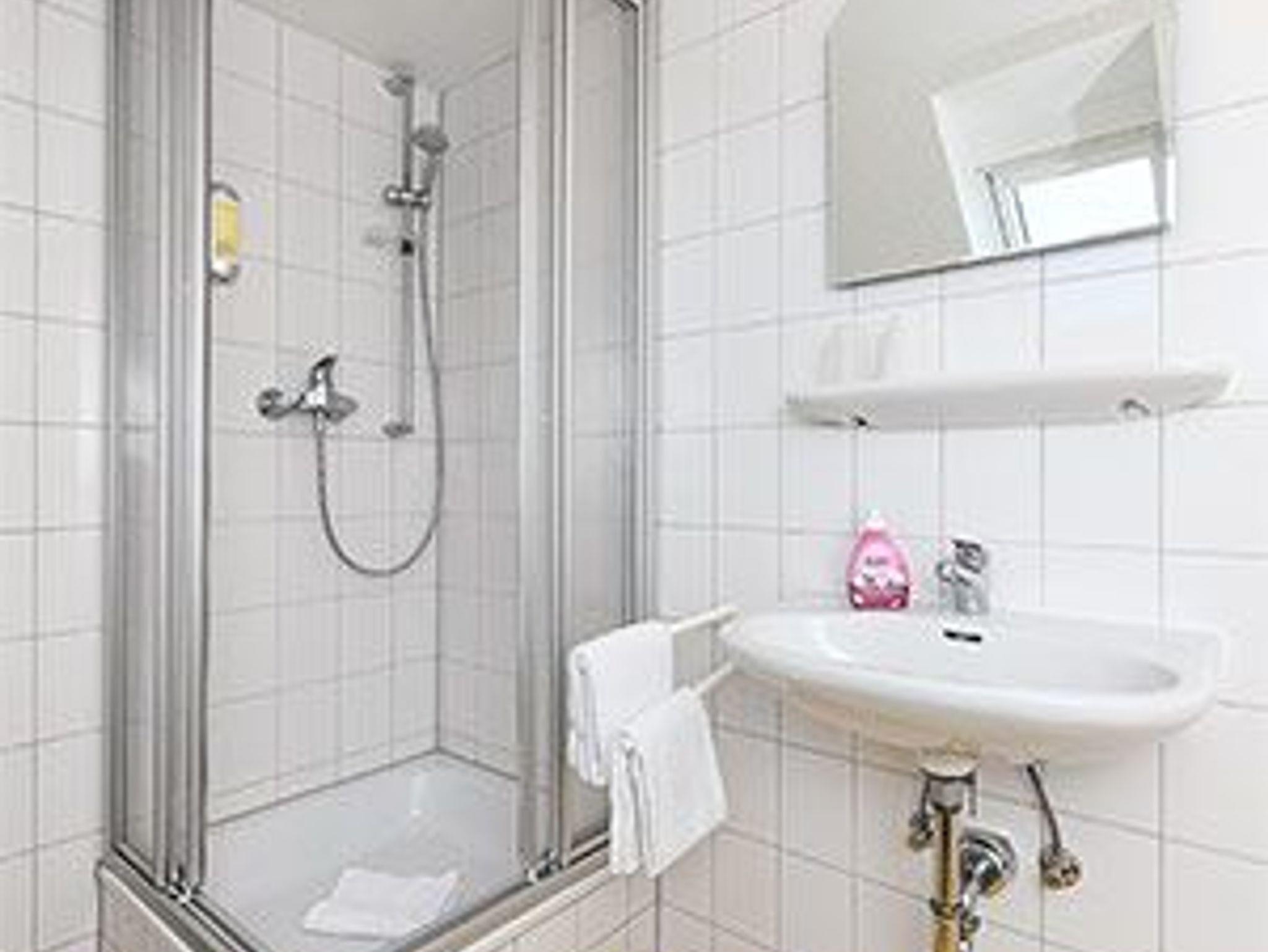 Badezimmer mit Dusche, Waschtisch und WC