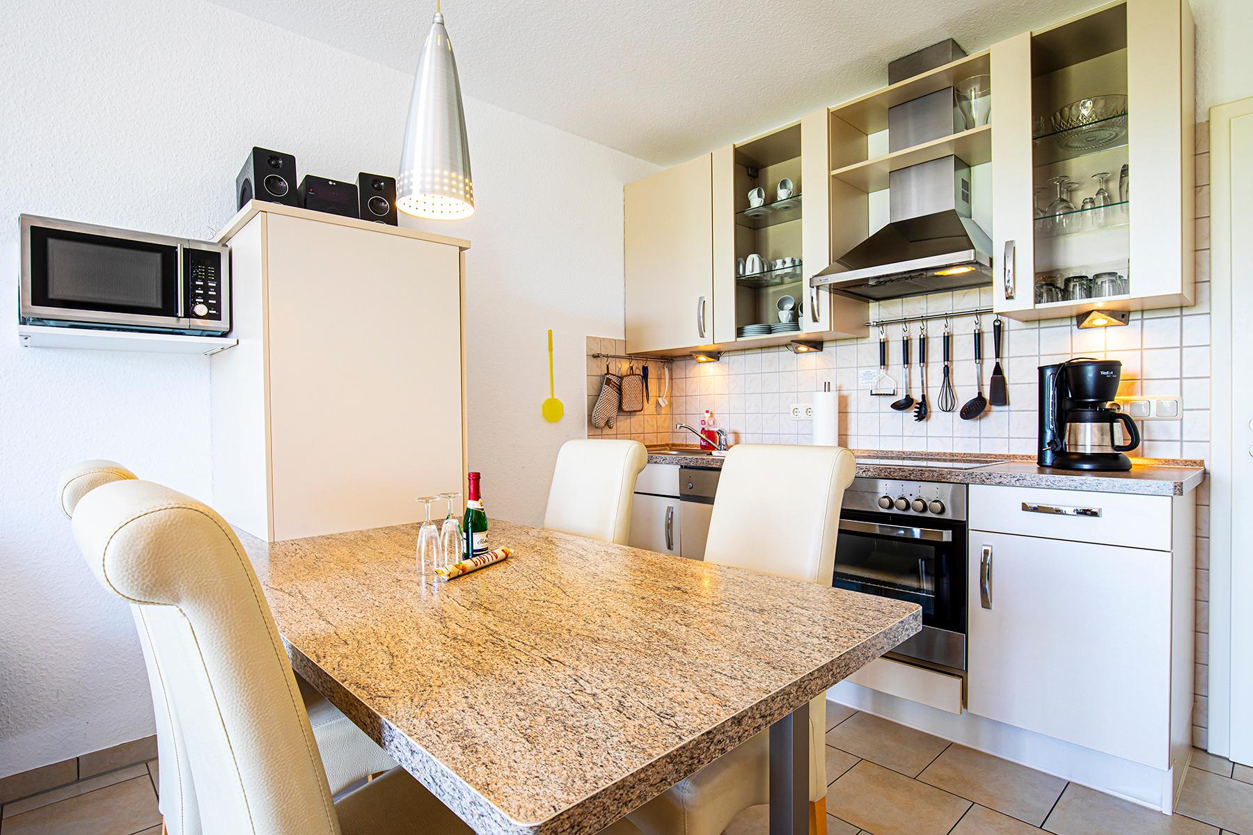 Ein großzügiger Wohn-Essbereich mit offener Küche bietet im Erdgeschoss angenehm Platz für alle Gäste. Angrenzend befindet sich eines von insgesamt zwei Badezimmern mit Dusche. Ein großes Schlafzimmer mit Doppelbett und französischem Balkon, ein zweites angrenzendes Bad mit Dusche sowie ein weiteres kleines Schlafzimmer für eine Person befindet sich in der ersten Etage.