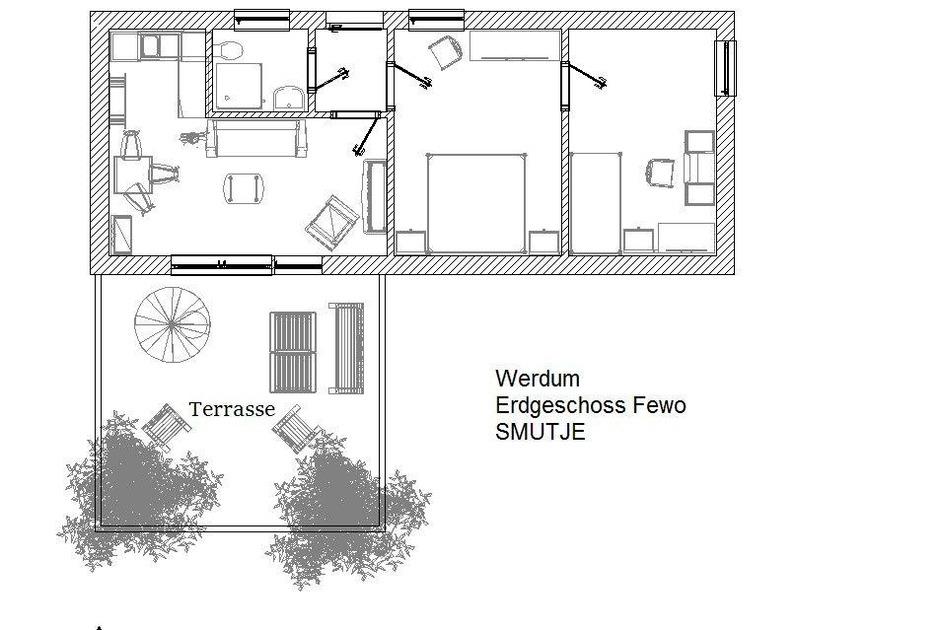 Endlich Urlaub! Gemütliche Erdgeschoss-Ferienwohnung mit Terrasse im Luftkurort Werdum. In dieser Ferienwohnung finden Sie ein Wohn- und Esszimmer mit Zugang zur geschützten Terrasse, eine Kochecke, ein Tageslicht-Duschbad und zwei Schlafräume.