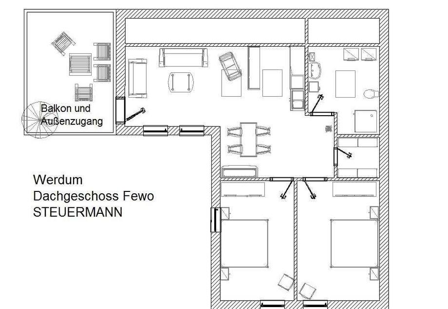 Endlich Urlaub! Dachgeschoss-Ferienwohnung Steuermann mit großem Balkon im Luftkurort Werdum. In dieser Fewo finden Sie ein Wohn-Esszimmer mit offener Küche, ein Tageslicht-Duschbad und zwei Schlafzimmer mit Doppelbetten sowie ein geschützter Balkon.