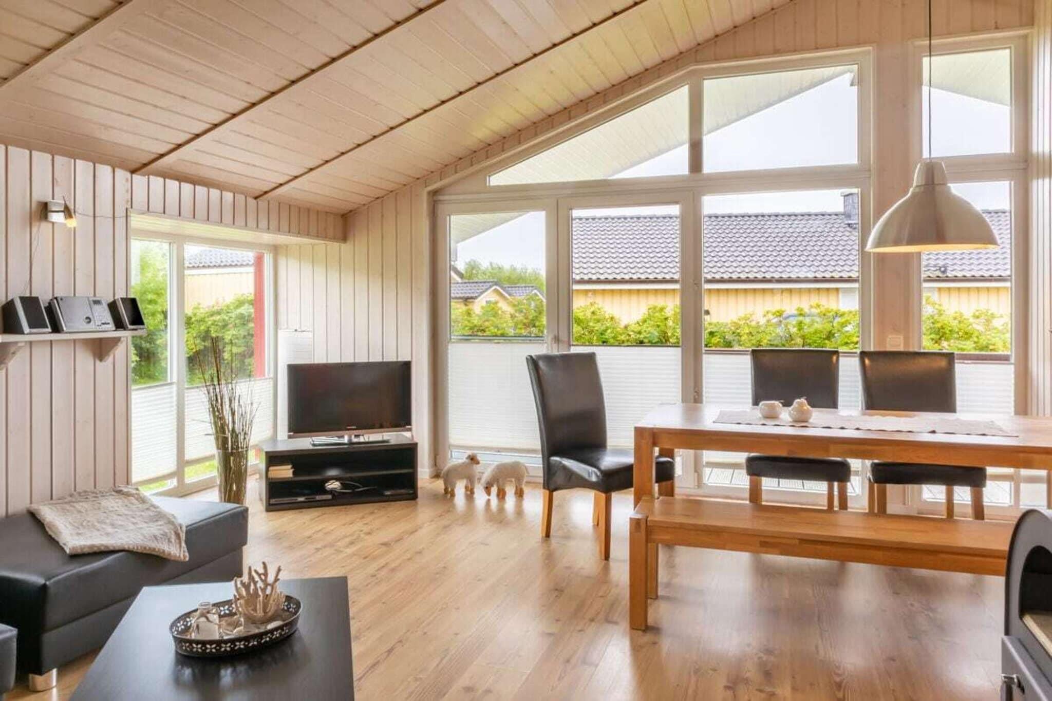 Skandinavisches Holzhaus mit Sauna und Kamin. Stilvoll eingerichtet für bis zu 5 Personen. Blick direkt auf den Deich, die Nordsee und der Naturstrand liegen ca. 200m entfernt. Familien mit Kindern oder Paare, die das Klima der Nordsee lieben und suchen oder Kennenlernen möchten, sind bei uns genau richtig. Einfach mal abschalten, den Alltagsstress hinter sich lassen, im Strandkorb auf der Terrasse mit Blick auf den Deich oder in der Sauna relaxen. Grillen im Garten auf dem Weber Grill oder Kochen in der gemütlichen Küche mit dem Thermomix - je nach Wetterlagen lässt es sich hier genießen. In unserem Haus könnt ihr die Nordsee in allen Zügen genießen - erst eine ordentliche Wanderung auf dem Deich, anschließend in der Sauna aufwärmen und vor dem Kamin relaxen. Das besondere Flair lädt dazu ein, den Alltagsstreß hinter sich zu lassen, und sich von der Stille und Gemütlichkeit treiben zu lassen. Das Haus verteilt sich auf ca. 68 qm. Vom Wohnzimmer aus gelangt man auf den kleinen Alkoven, auf dem sich eine Matratze auf dem Boden befindet, wo eine fünfte Person schlafen kann. Vom Wohnzimmer aus gelangt man in das Schlafzimmer mit Doppelbett und Ausgang auf die Südterrasse. Auch das Bad mit Sauna geht vom Wohnzimmer ab. Durch die Eingangstür betretet ihr direkt die Küche, von der das Zimmer mit den beiden Etagenbetten abgeht. Bad und Küche sind mit eleganten dunklen Fliesen gekachelt, im Wohnzimmer und den Schlafzimmer findet ihr Laminat in Holzoptik. Der große Esstisch mit bis zu 6 Sitzgelegenheiten befindet sich ebenfalls im Wohnzimmer. Dort ist auch der Fernseher und die Musikanlage.