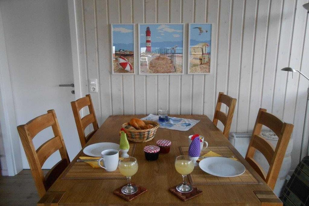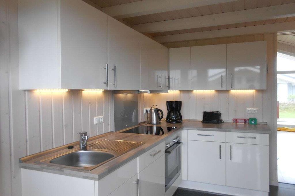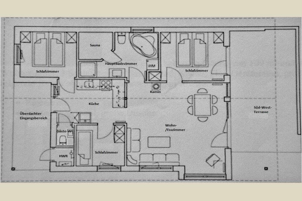 , , Küche(, , , Herd, Kochplatte, Wasserkocher, Toaster, Kaffeemaschine, Spülmaschine, Kühlschrank, Tiefkühlschrank), Wohn/Esszimmer(, , Bibliothek, TV, Esstisch, Kaminofen, DVD-Spieler, Radio, Hochstuhl, Fliegenfenster), Schlafzimmer(, Doppelbett, TV, Fliegenfenster), Schlafzimmer(, Etagenbett, Fliegenfenster), Schlafzimmer(, , Doppelbett, Fliegenfenster), Badezimmer(, , Toilette, Sauna, Badewanne, Hottub, Dusche, Waschbecken, Waschmaschine, Heizung, Föhn), guest toilet(, Toilette, Waschbecken), Internet, Erste-Hilfe-Station, Waschmaschine, Terrasse(, Liegewiese, Grill, Gartenmöbel, Liegen), Parkplatz, Trockenschrank