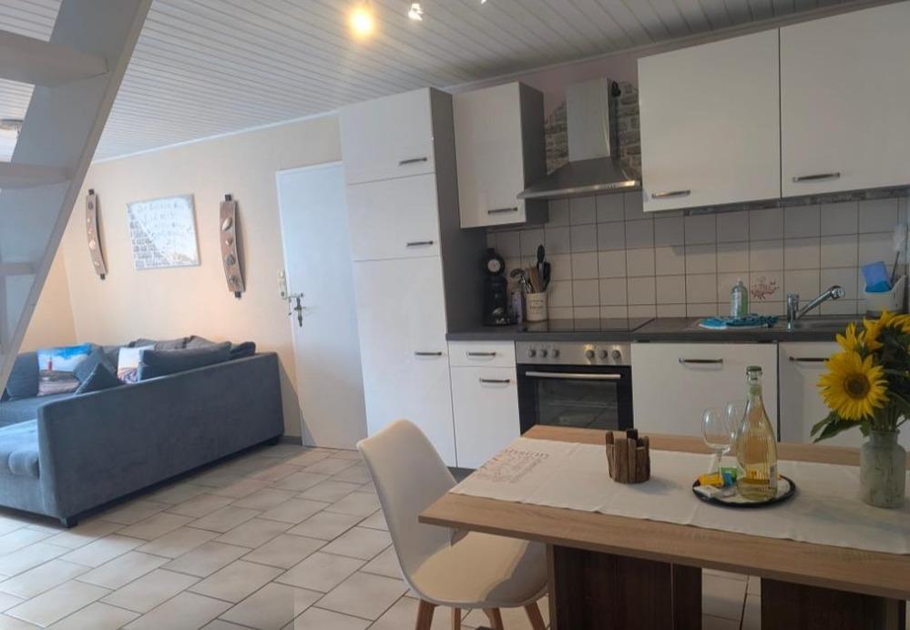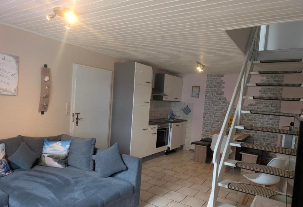Neben dem Wohnraum, der den Mittelpunkt der Ferienwohnung ausmacht (75 qm), ausgestattet mit bequemer Sofaecke sowie integrierter Einbauküchenzeile, befindet sich das große Duschbad und das größere Schlafzimmer mit Doppelbett (1,80 x 2 m). Alles großzügig und schön ebenerdig. Es führt eine dekorative Holztreppe ins Obergeschoß zu 2 gemütlichen Schlafräumen, 2. Schlafraum mit einem Doppelbett (1,80 x 2 m) 3. Schlafraum mit 2 Einzelbetten ( 0,90 x 2 m ) unter dem Dach. Handtücher/Bettwäsche inklusive. Vor der geräumigen Ferienwohnung befindet sich eine Terrasse mit Gartenmöbel.