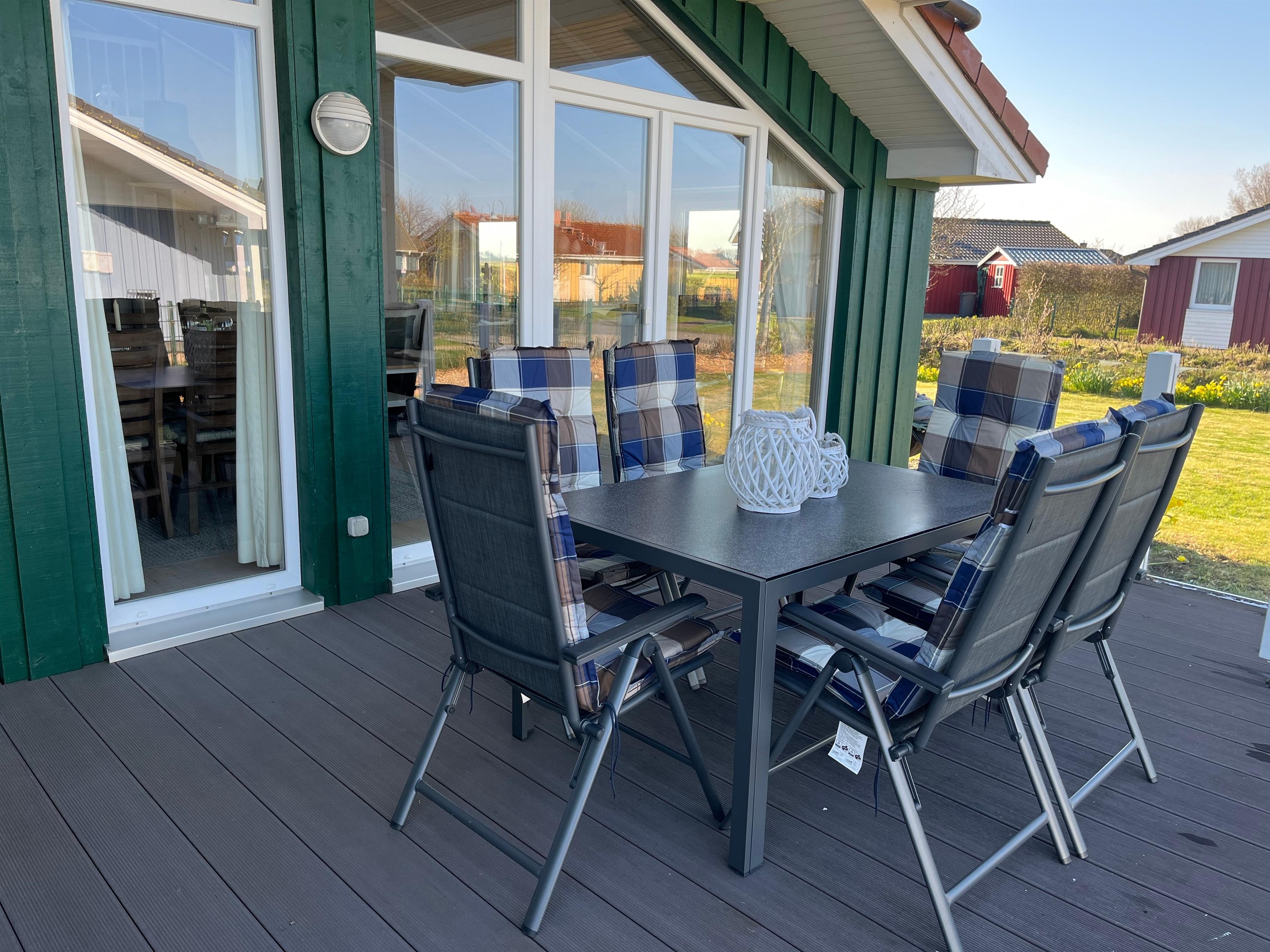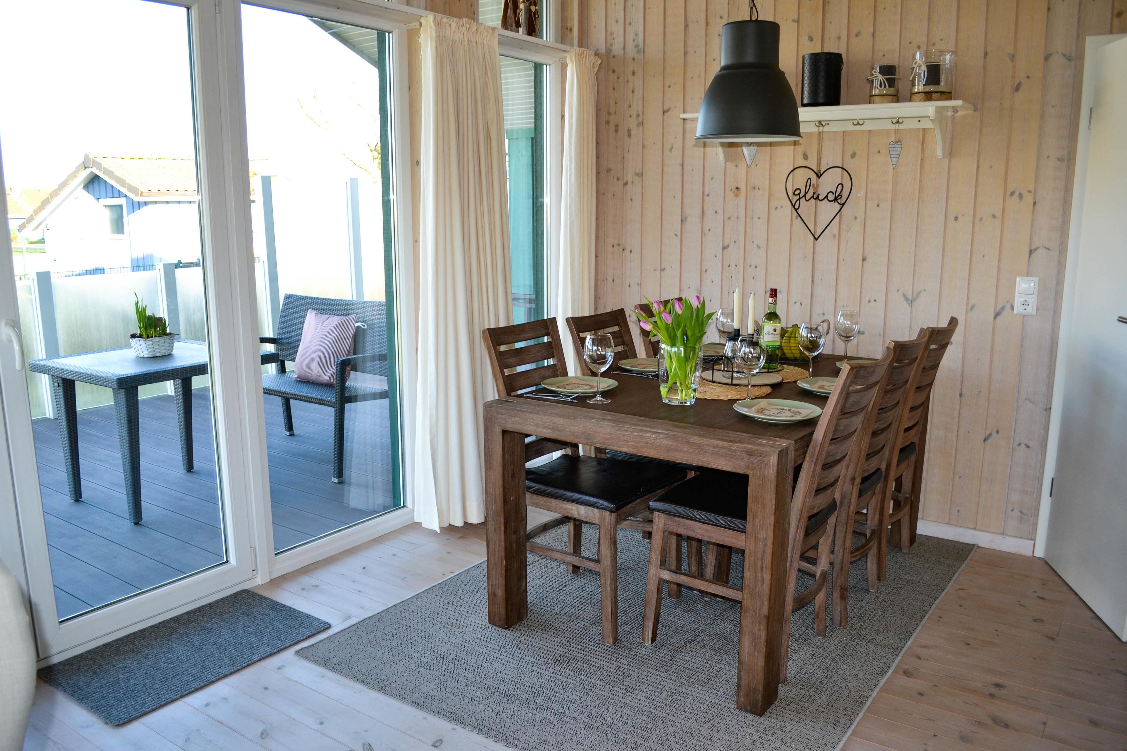 Das moderne Ferienhaus Deichglück verfügt über einen offenen Wohn-/ Essbereich mit angrenzender, überdachter Terrasse. Die moderne Küche ist ausgestattet mit einem Kühlschrank, Backofen, Cerankochfeld, Spülmaschine und sämtlichen Küchenkleingeräten. Die direkt an den Wohnraum angrenzende Terrasse ist überdacht und mit einem Windschutz aus Glas umrandet. Im modern gestalteten Wohnbereich bereitet Ihnen ein integrierter Kamin auch bei schlechten Wetterverhältnissen einen gemütlichen Nordseeaufenthalt.