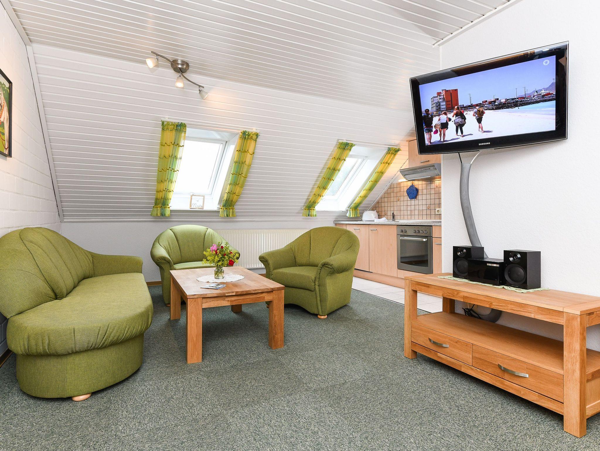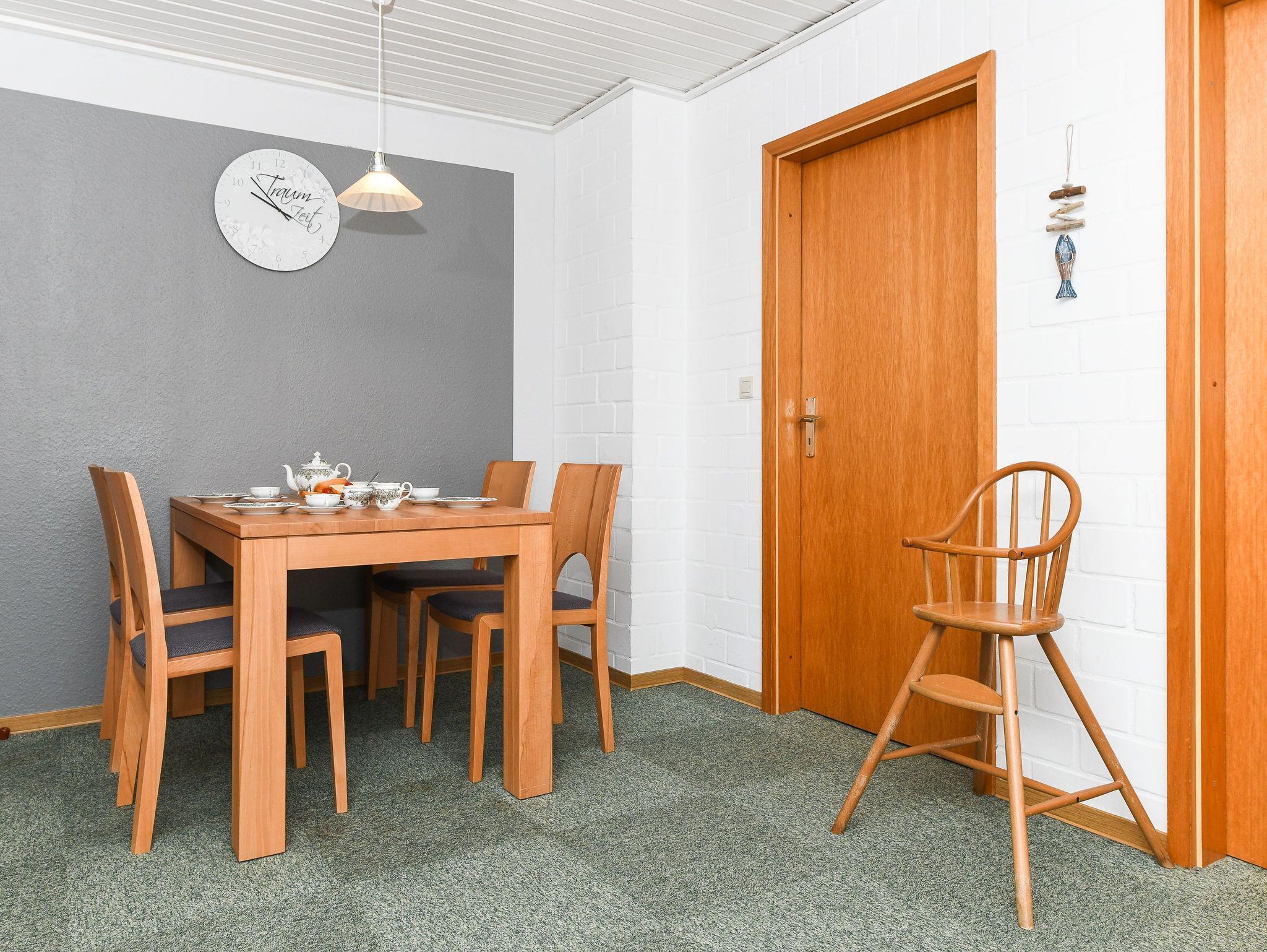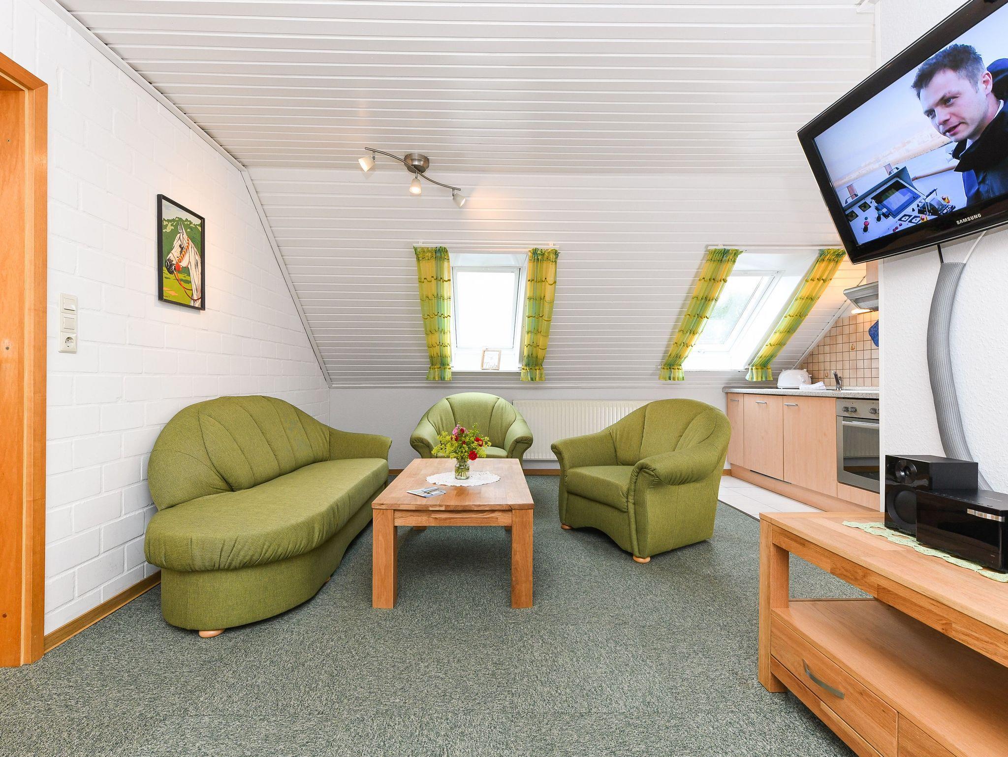 Größe ca. 60 Quadratmeter, Wohnraum mit integrierter Küche, Schlafzimmer, zweites separates, Schlafzimmer/Kinderzimmer, Badezimmer mit Dusche, Waschtisch und WC, Obergeschoss, optimal für 2 bis 5 Personen und zusätzlich ein Kleinkind.