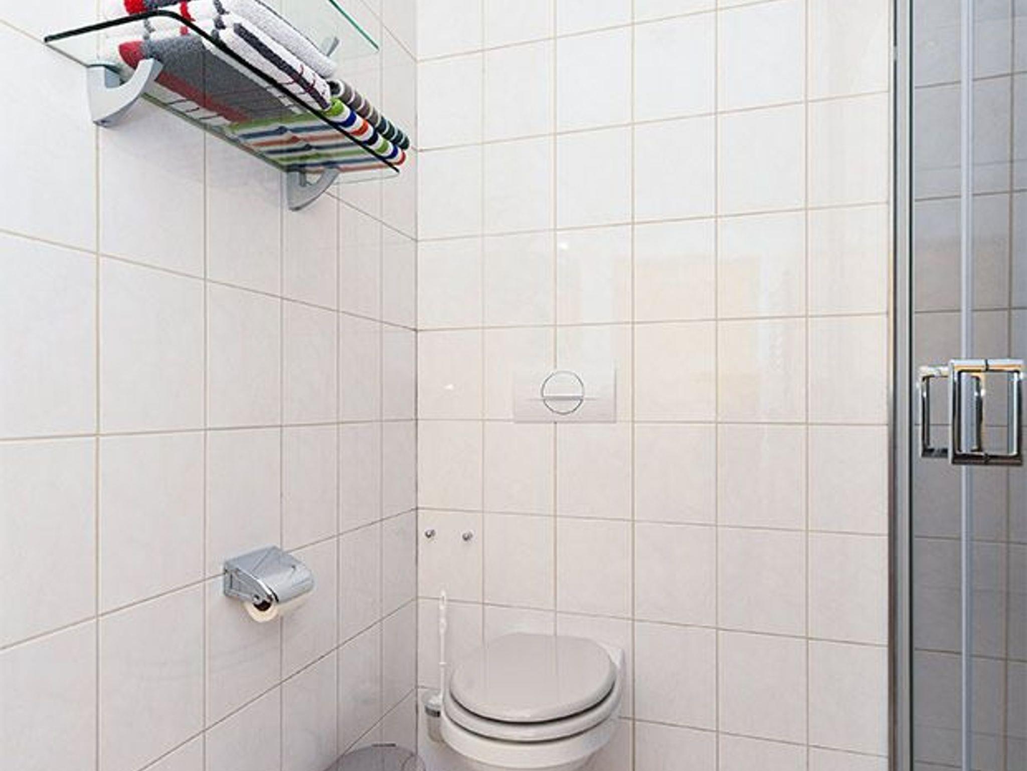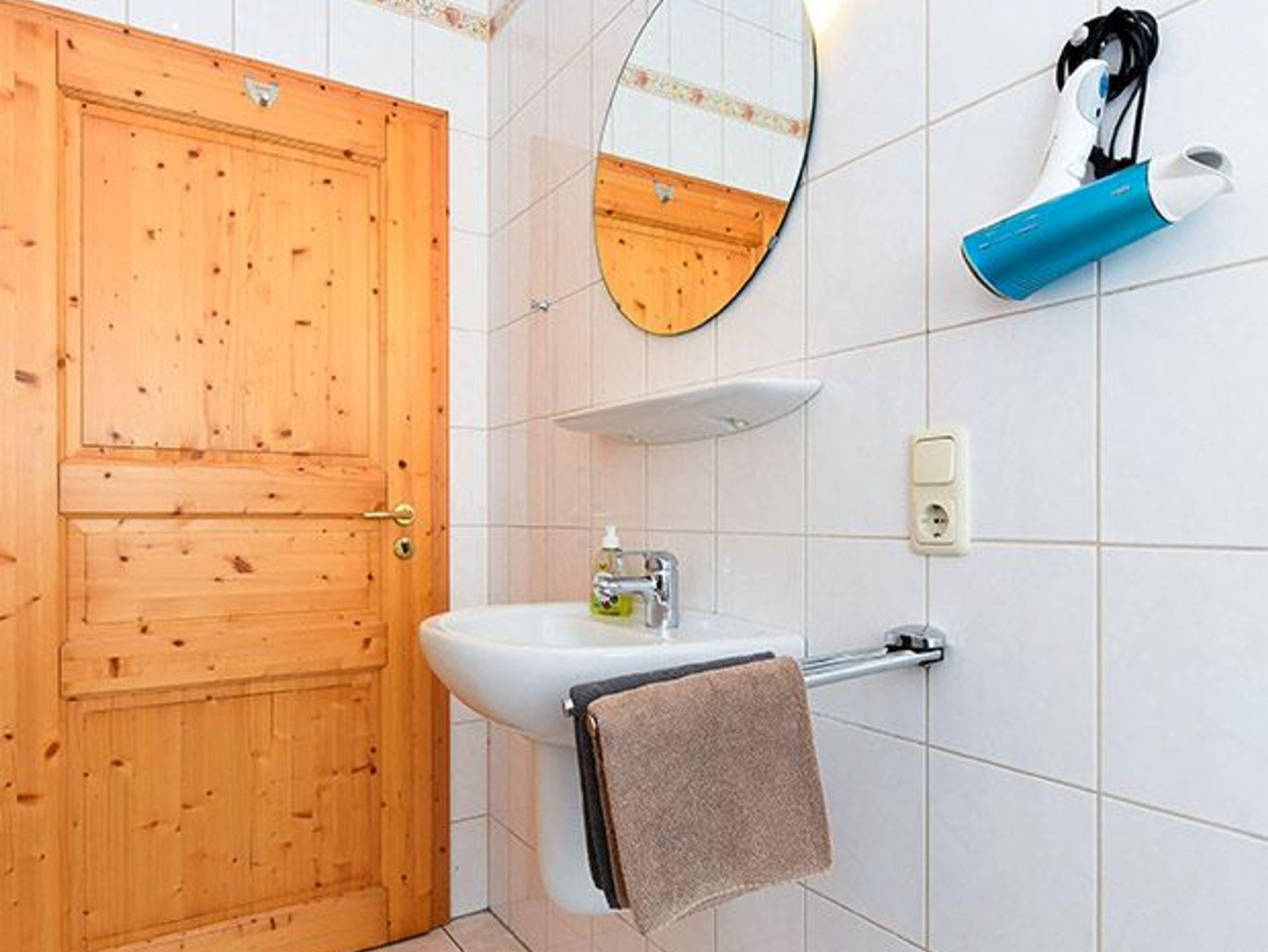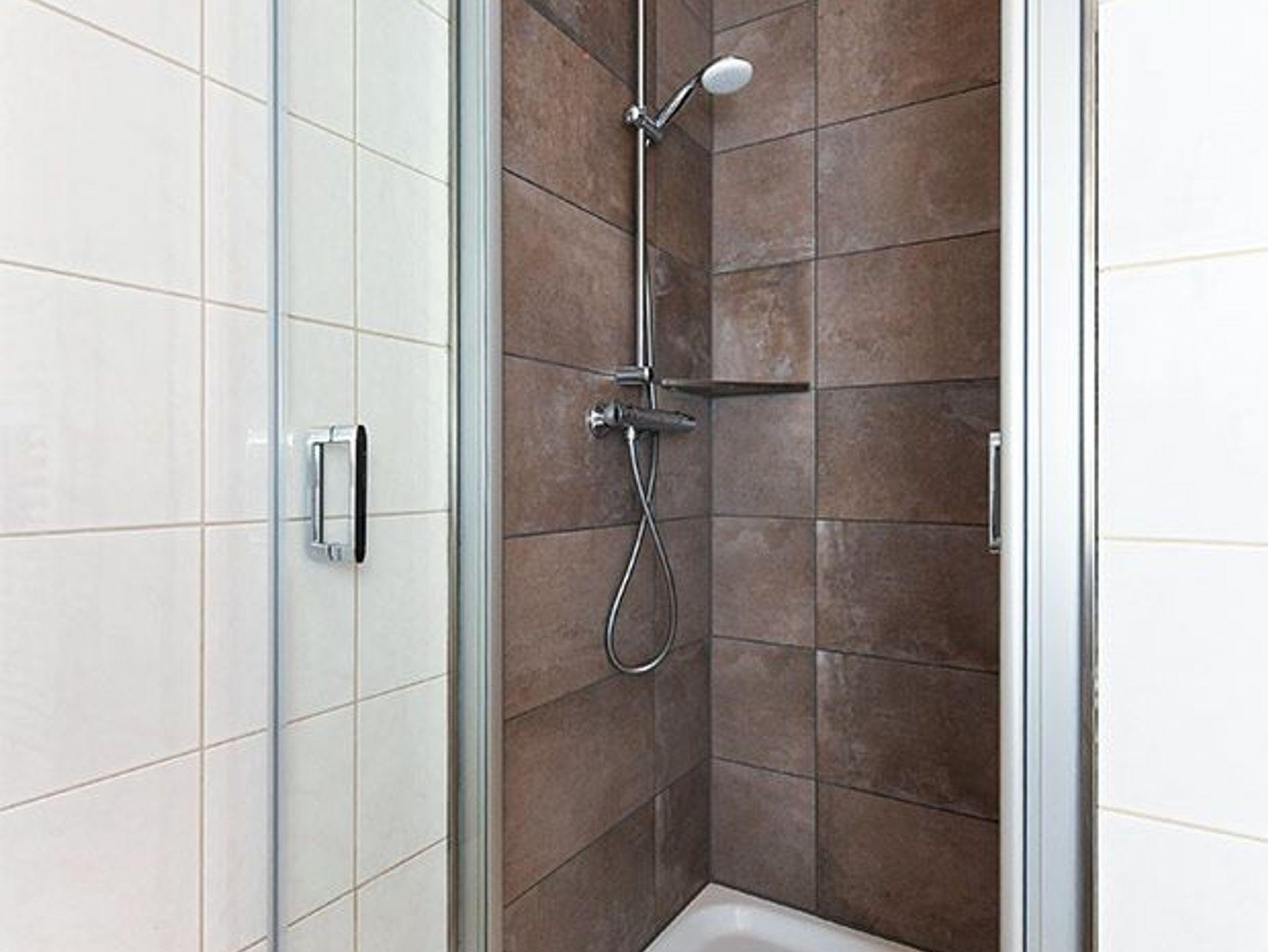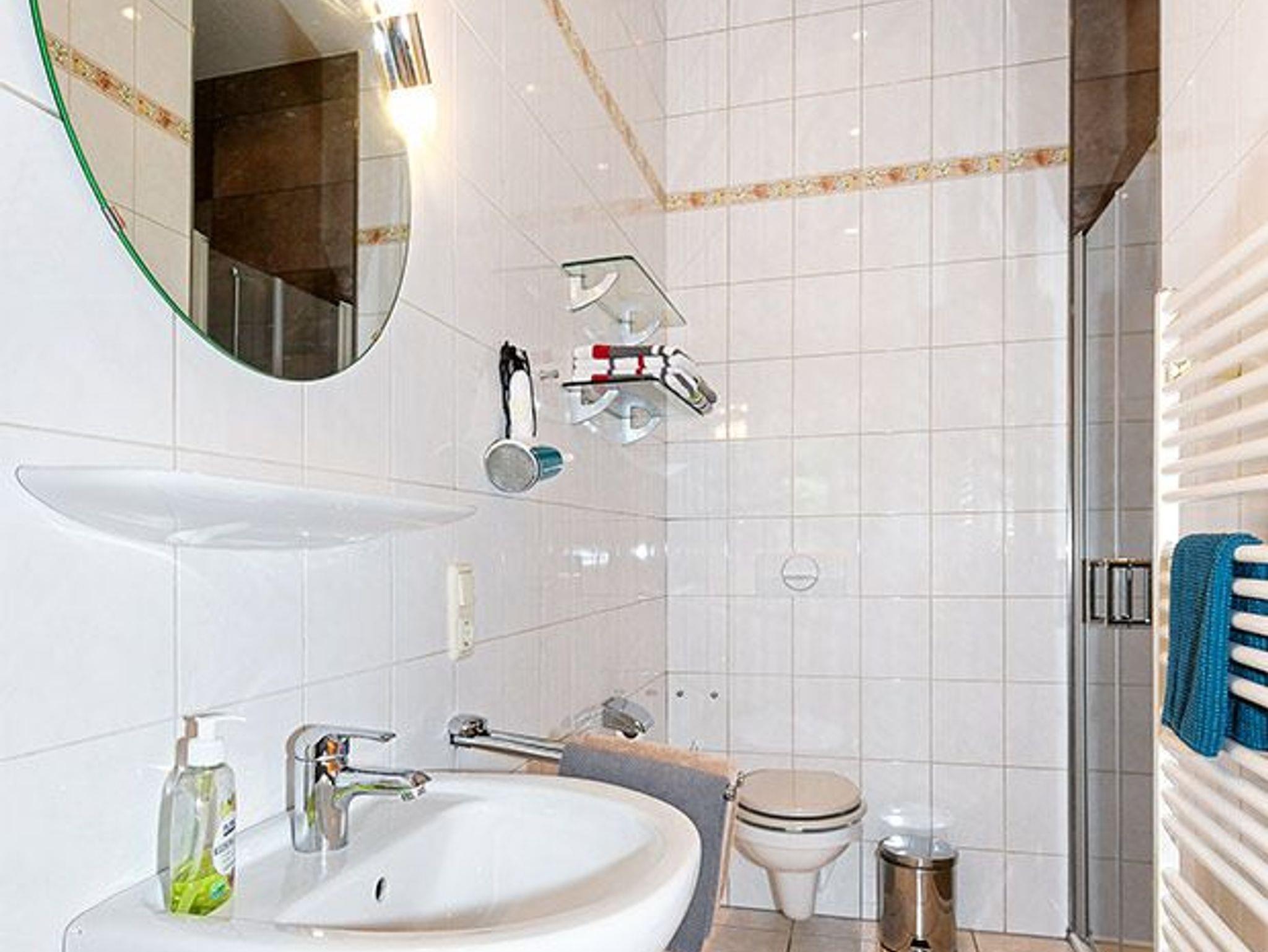 Badezimmer mit Dusche, Waschtisch und WC, Erdgeschoss, Terrasse, optimal für 2 bis 5 Personen.