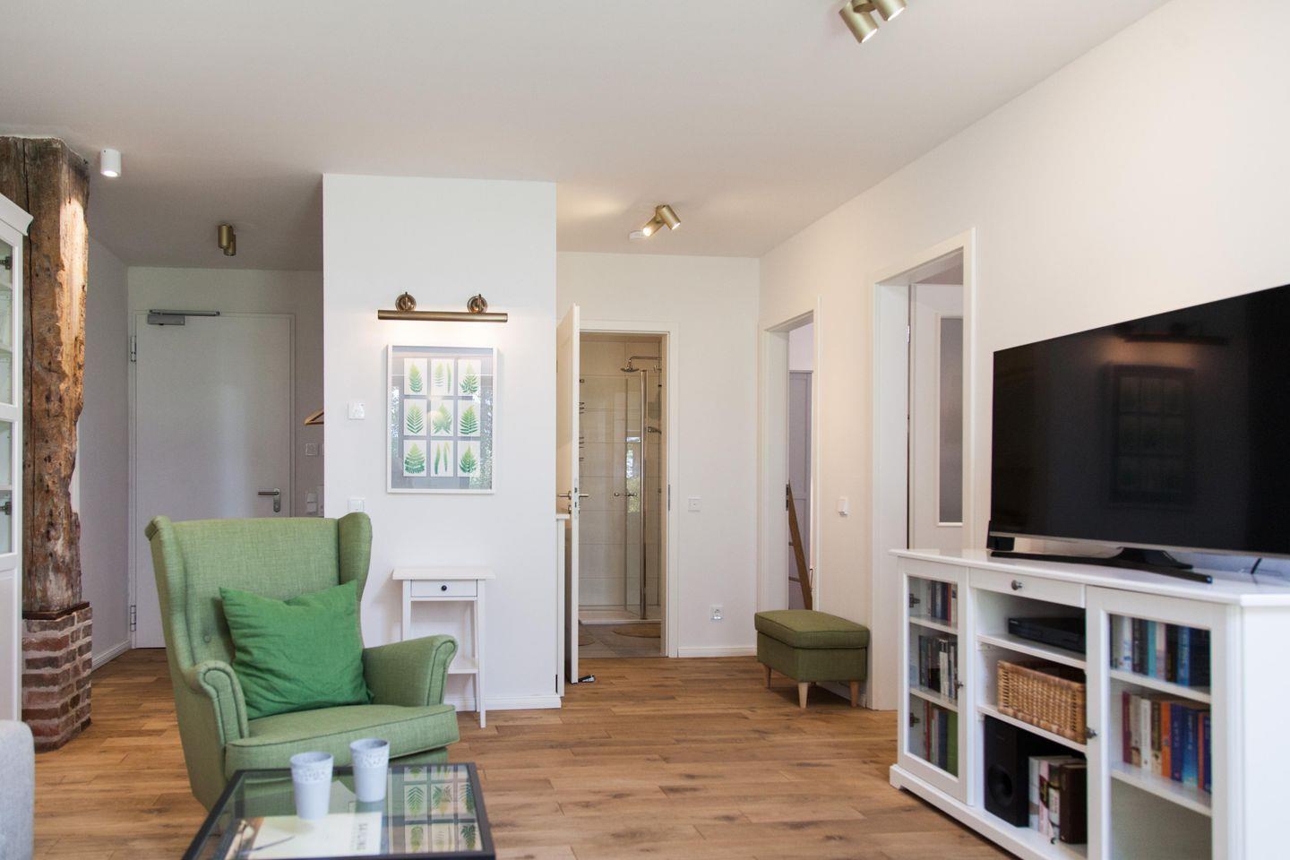 Die Wohnung verfügt über zwei gemütliche Schlafzimmer, die mit einem hochwertigen Parkettboden ausgestattet sind und einen erholsamen Schlaf gewährleisten. Das helle und einladende Wohnzimmer bietet eine bequeme Sofaecke sowie einen Essbereich, ideal für gemeinsame Mahlzeiten. Die große Fensterfront sorgt für viel Tageslicht und einen angenehmen Blick auf den angrenzenden Garten. Hier können Sie entspannte Stunden verbringen, sei es bei einem spannenden Buch oder beim Spielen mit der Familie.
