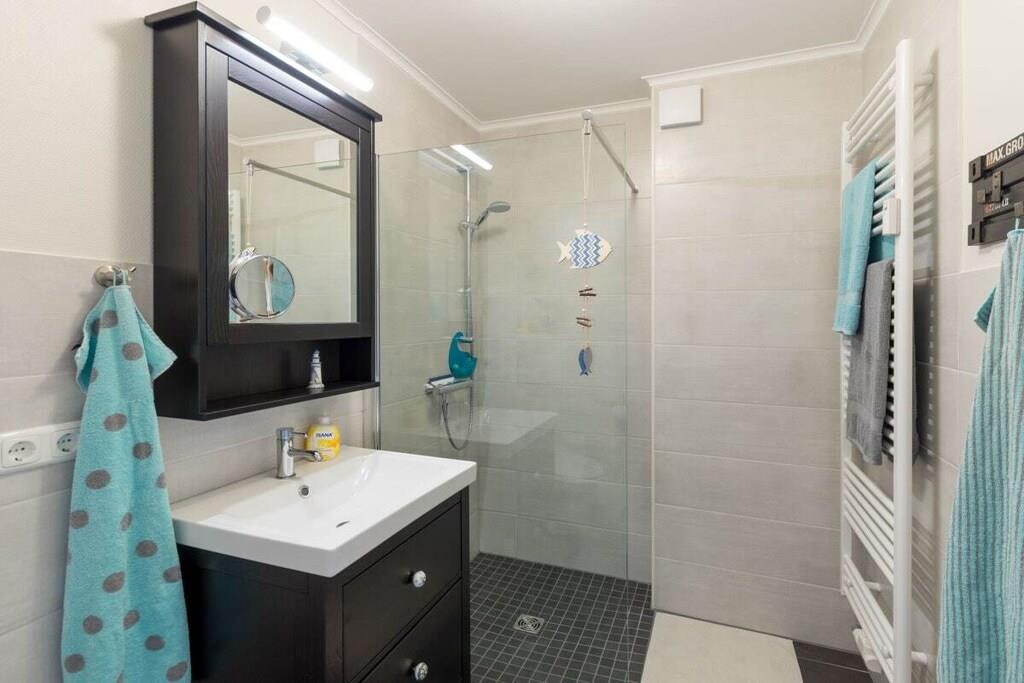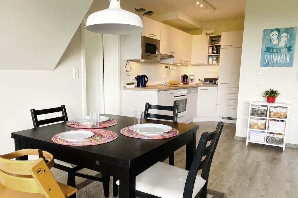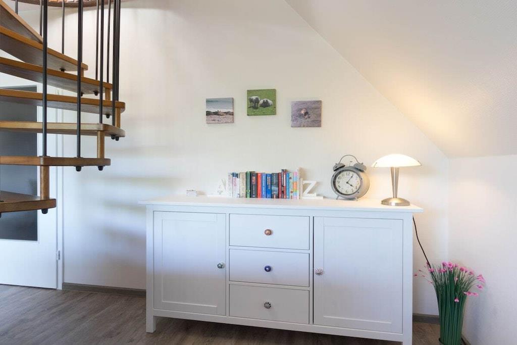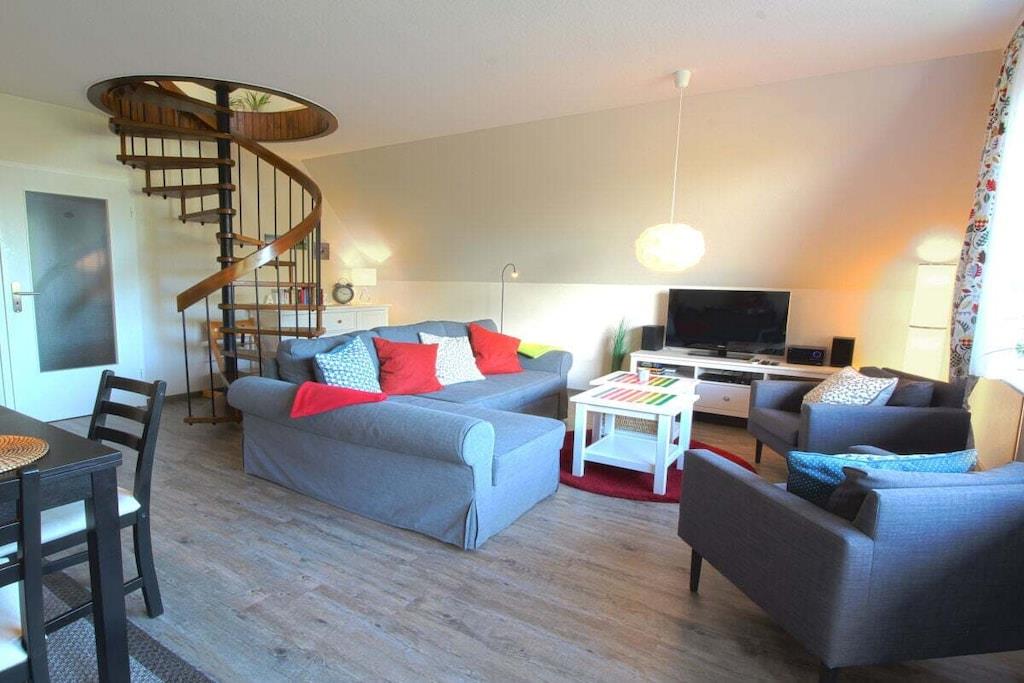 Ihre Ferienwohnung ist ca. 70m² groß, bietet optimalen Komfort für 4 Personen und ist u.a. mit einem Balkon ausgestattet. Wir haben Ihre Ferienwohnung im Frühjahr 2017 komplett renoviert und neu möbliert. Sie bietet ein geräumiges Wohn-Esszimmer mit großem Balkon und voll ausgestatteter offener Küche, ein separates Schlafzimmer und einen Spitzboden, den Sie über die charmante Wendeltreppe direkt vom Wohnraum aus erreichen, außerdem ein Duschbad und den Flur mit Garderobe. Vier Personen finden hier reichlich Platz. Einen kostenlosen Internetanschluss (WLAN) und Telefon mit Flatrate ins deutsche Festnetz stellen wir bereit. In den Monaten Mai - September ist ein Strandkorb an der Badestelle Stinteck inklusive! In der Wohnung steht Ihnen eine Waschmaschine mit Trockner zur Verfügung.