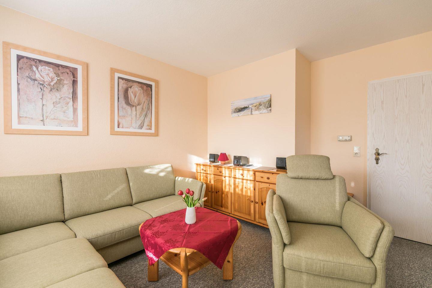 Ecksofa, 1 Sessel, Esstisch mit Stühlen, Sat-TV, DVD-Player, Stereo-Anlage mit CD-Player, Kommode, Zugang zur Südterrasse mit Gartenmöbel, Garten