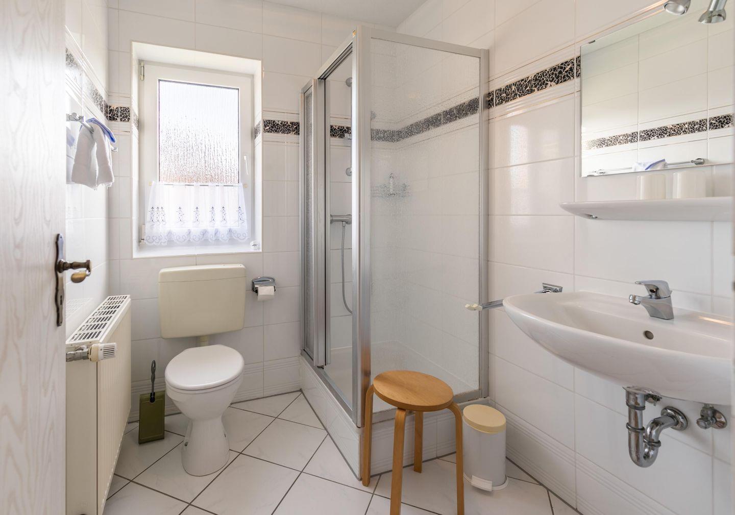 Fenster, WC , Duschkabine, Waschbecken, Spiegel, Hocker, Ablageflächen