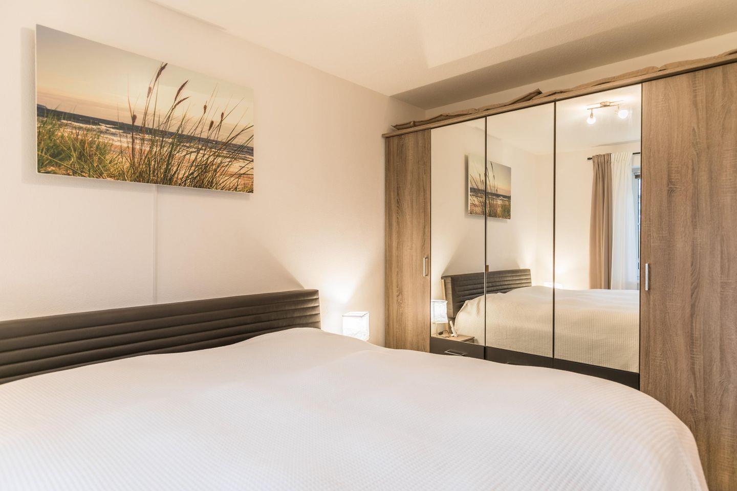 Doppelbett mit getrennten Matratzen (je 200x 90x 55 cm), Nachttische + Lampen, Kleiderschrank5-türig mit Ganzkörperspiegel, Verdunkelungsrollos und Vorhang, Fliegengitter