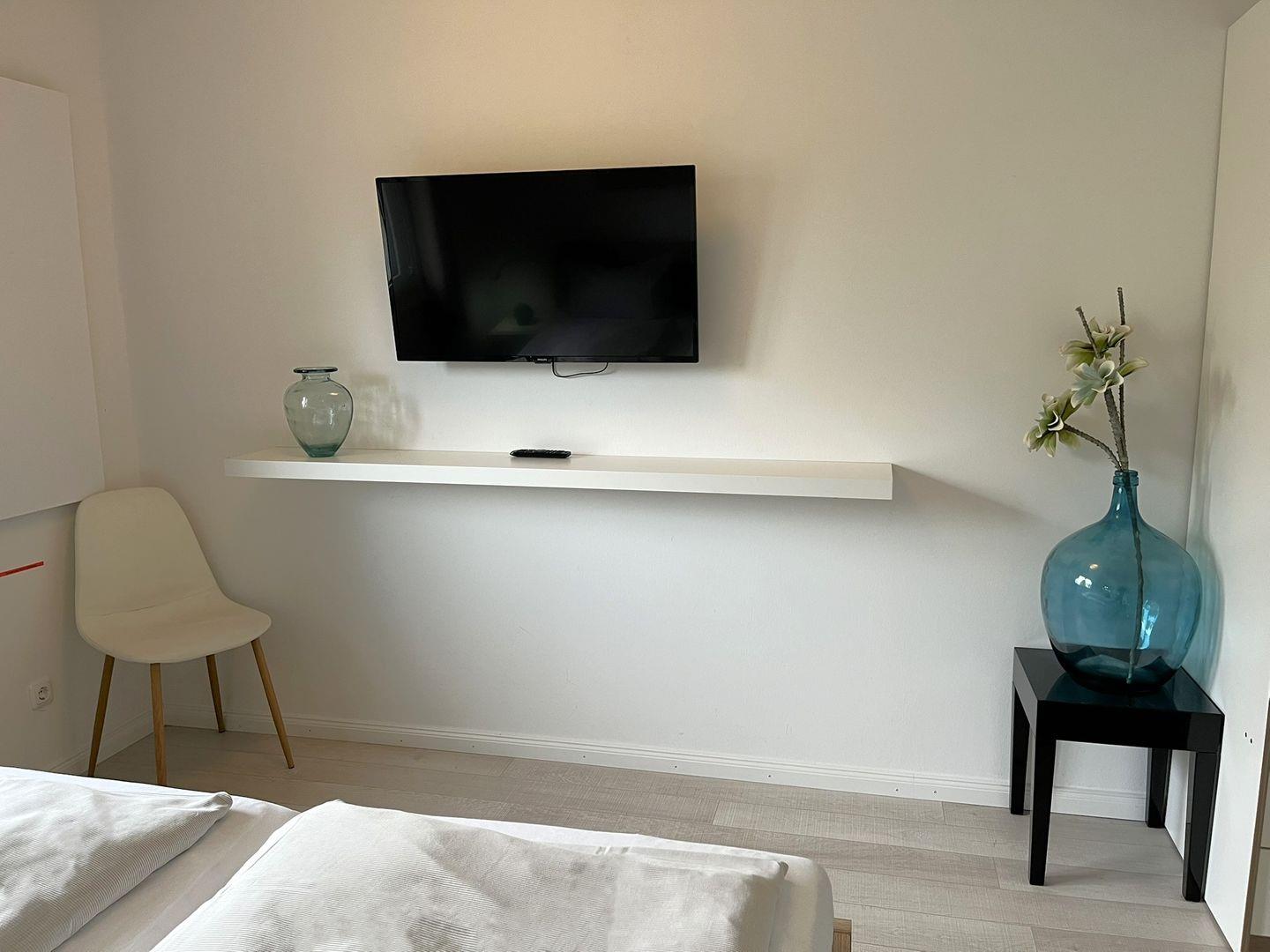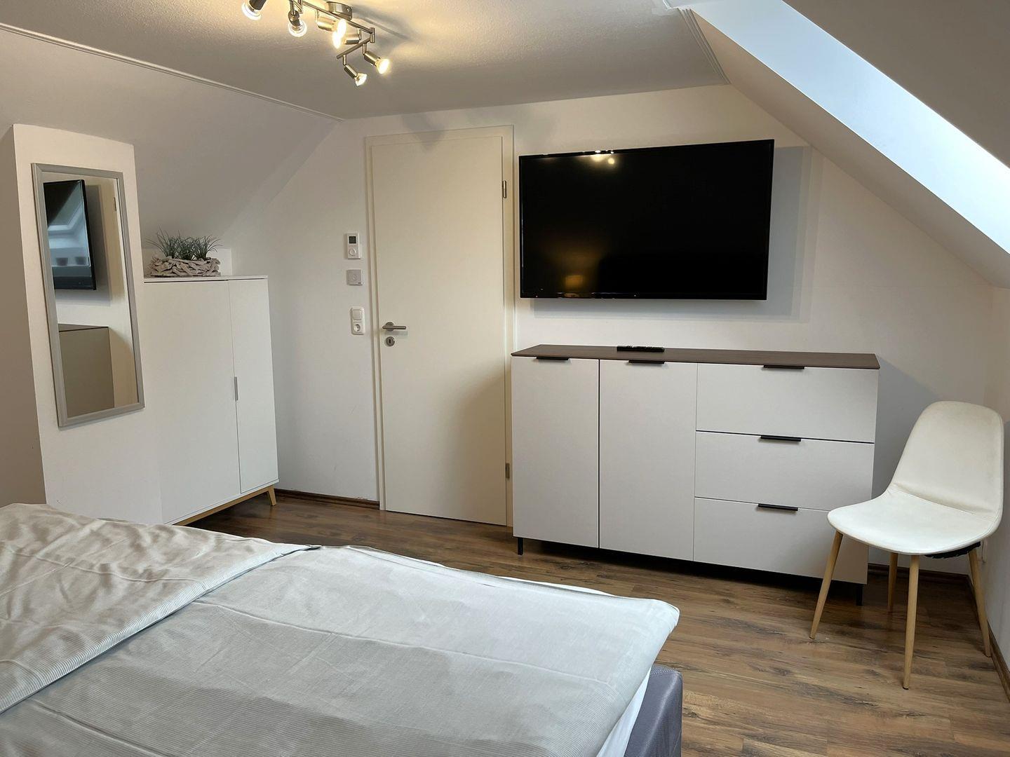 Ein zweites tolles Schlafzimmer auch mit TV, das man über eine Treppe im Wohnzimmer erreicht, befindet sich im ersten Stock. Auch hier gibt es ein Boxspring- Doppelbett (1,80x 2m, mit durchgehenden Topper).
