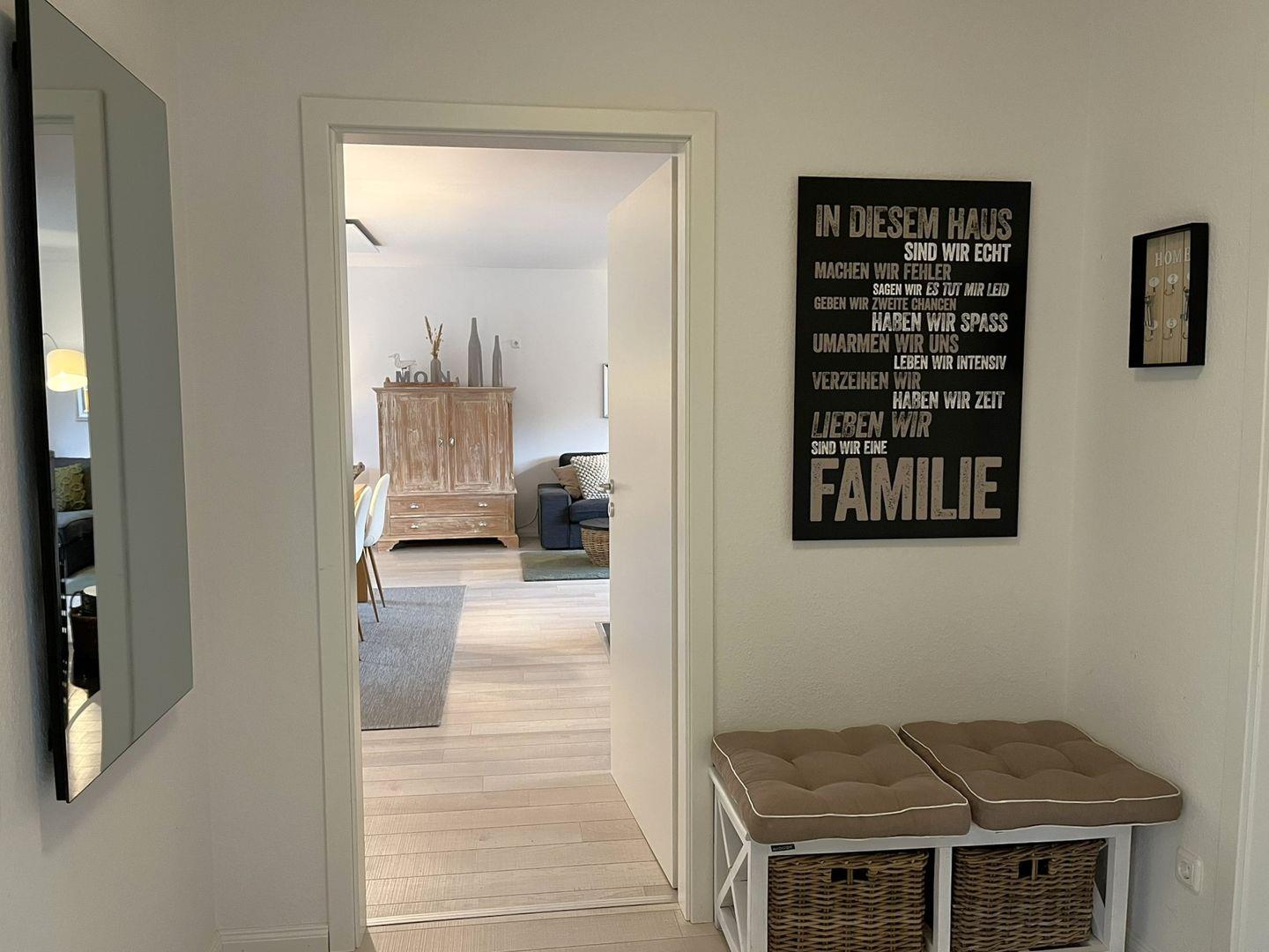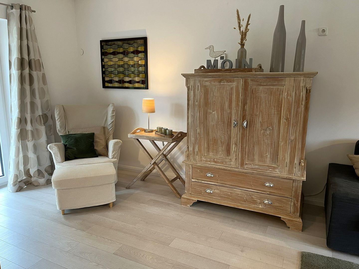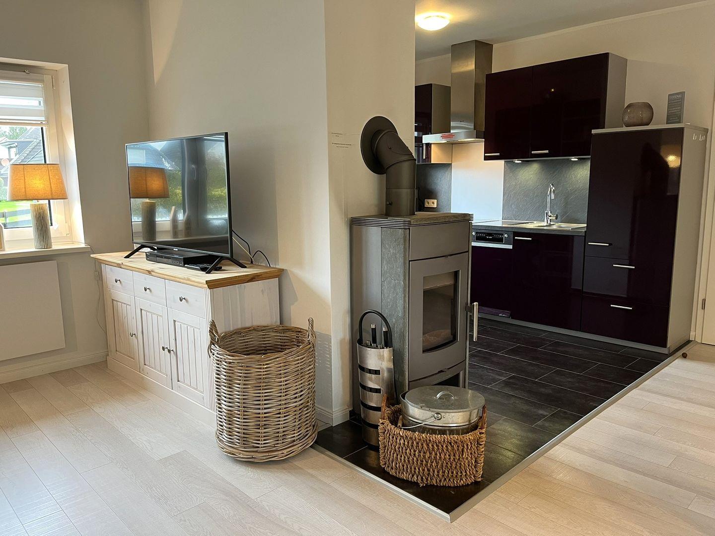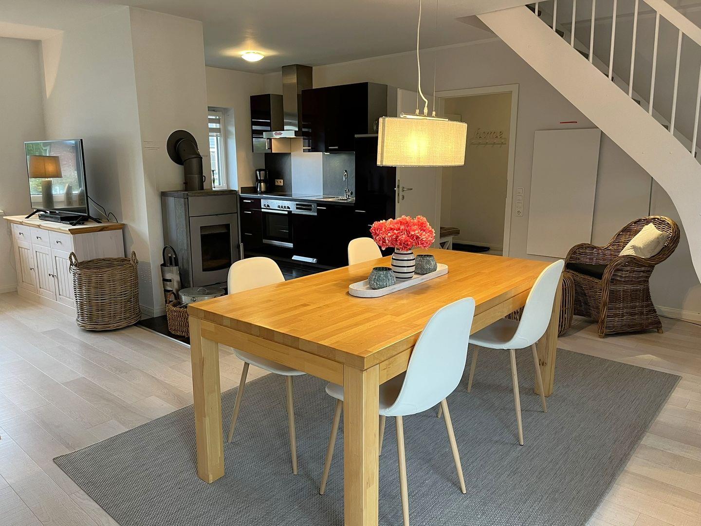 In dem geräumigen Wohn- Essbereich bemerkt man sofort, das jedes einzelne Stück mit Liebe ausgesucht wurde. Ob man es sich auf der Wohnlandschaft, bei einem Film oder einem Buch, gemütlich macht oder ob man sich um den Esstisch versammelt, um in aller Ruhe zu klönen. Das ganze Haus wird mit Infrarot Heizkörpern an den Wänden beheizt. Bei nicht so schönem Wetter können Sie den Kaminofen anfeuern. Einfach Gemütlichkeit pur.