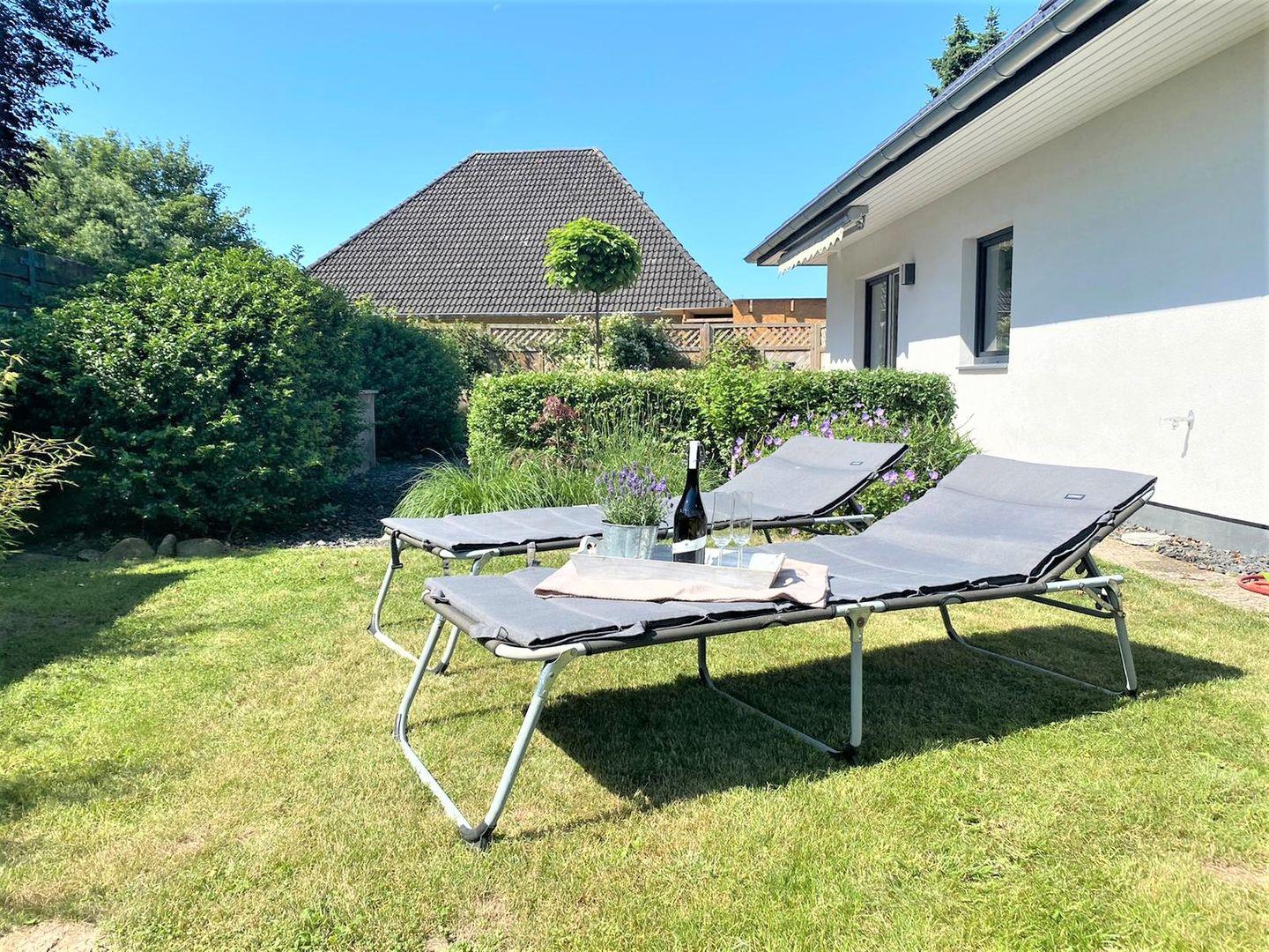Der große Garten mit seiner schönen Holzterrasse, den Sonnenliegen und einer Sandkiste für unsere kleinen Gäste, auf der Rückseite des Hauses, lädt zum Verweilen ein.