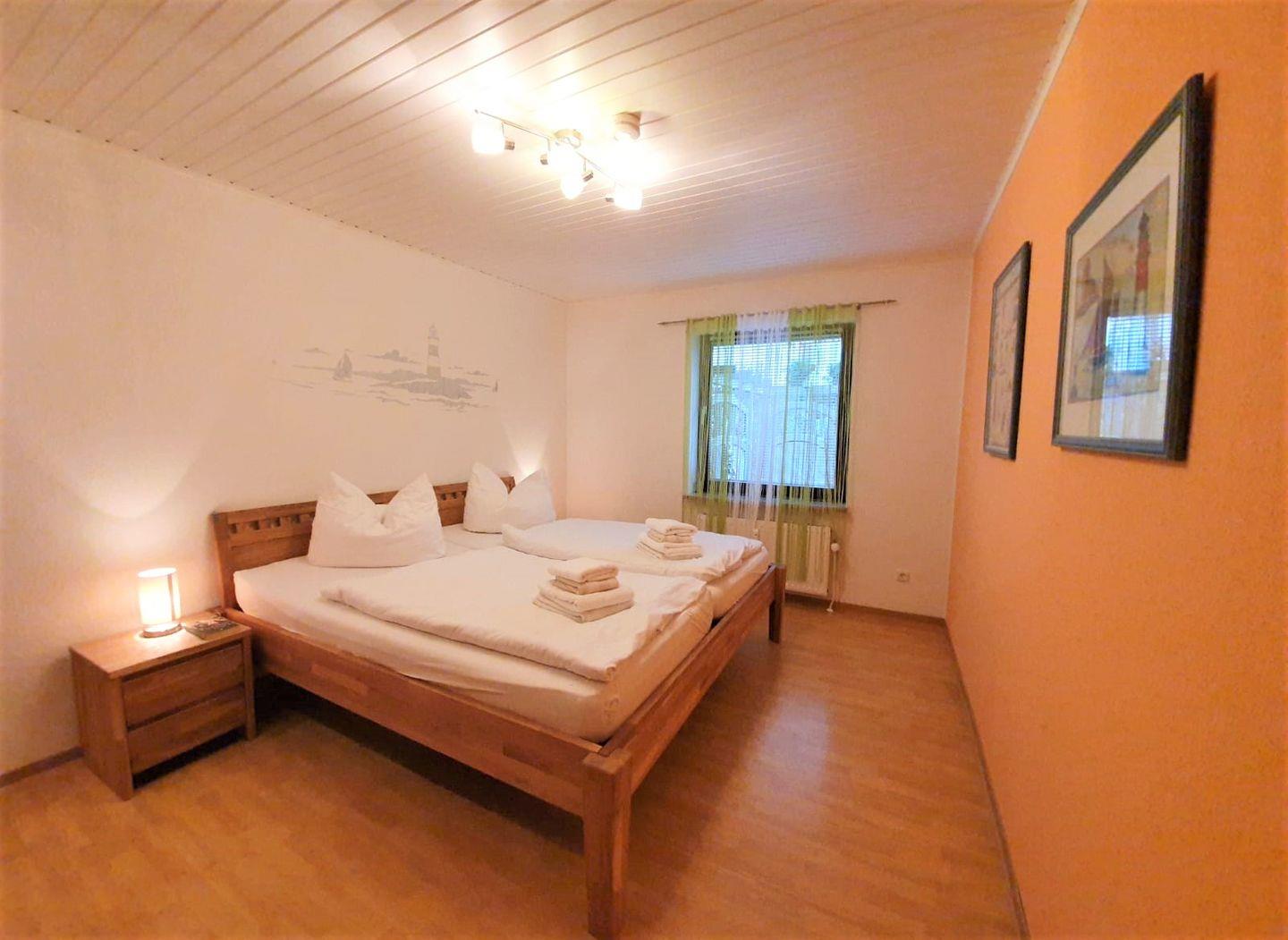 Das geräumige Schlafzimmer ist mit einem Doppelbett (2m x 2m mit Einzelmatratzen), einem Kleiderschrank und Verdunklungsmöglichkeiten ausgestattet, auch ein Babyreisebett findet hier genügend Platz.