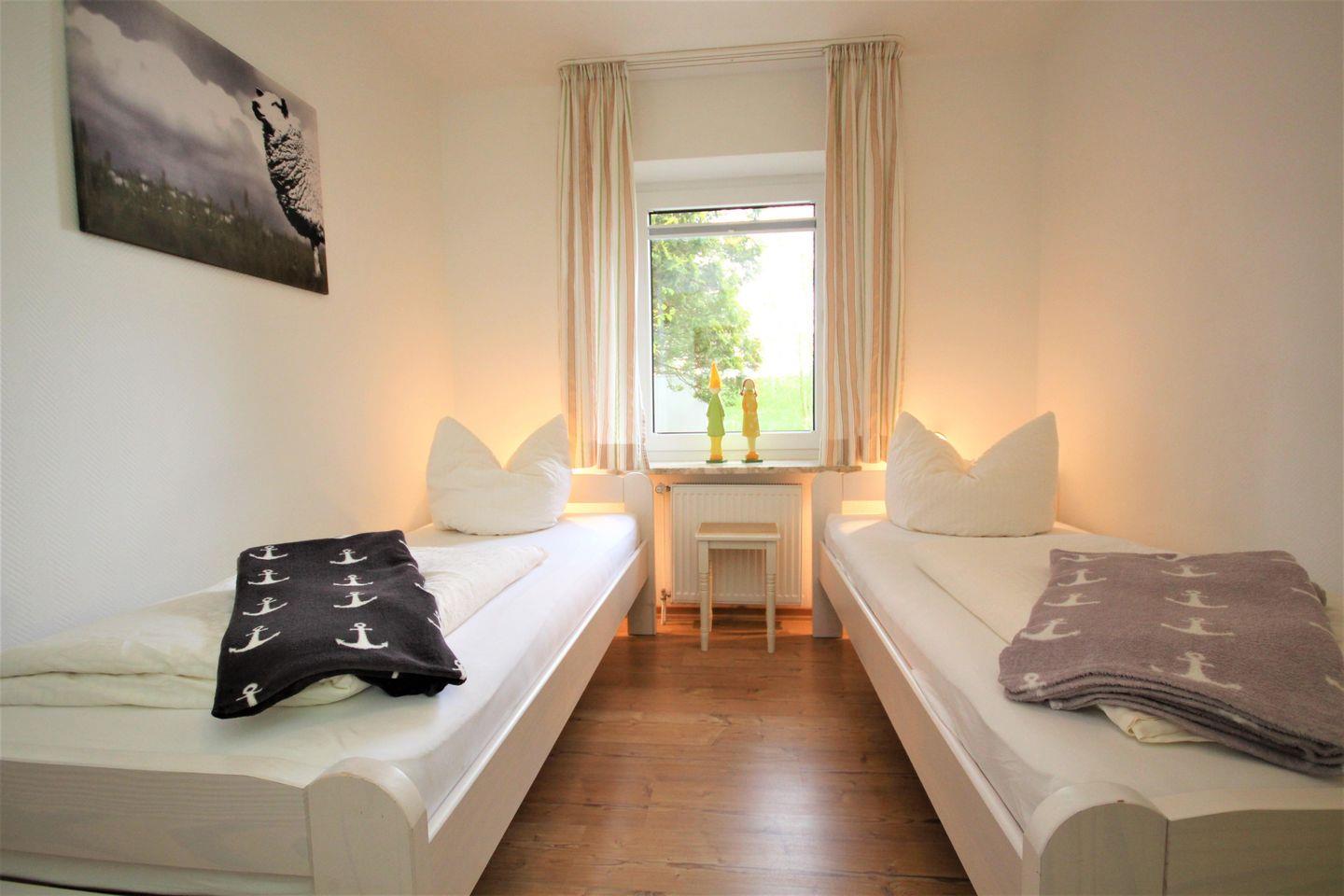 Von den 2 Schlafräumen ist eines mit einem Doppelbett ( 2 Einzelmatratzen) und das andere mit 2 Einzelbetten eingerichtet. Platz für ihre Urlaubsgarderobe gibt es ausreichend. Ein Kinderbett für kleine Gäste (bis 2 Jahre) steht kostenfrei zusätzlich bereit.