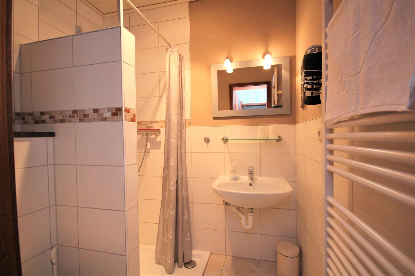 Das Badezimmer mit Dusche, Handtuchwärmer und Föhn ist, wie der Rest der Wohnung, schick und modern.