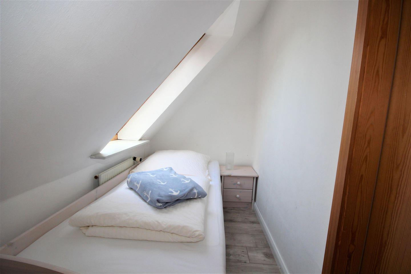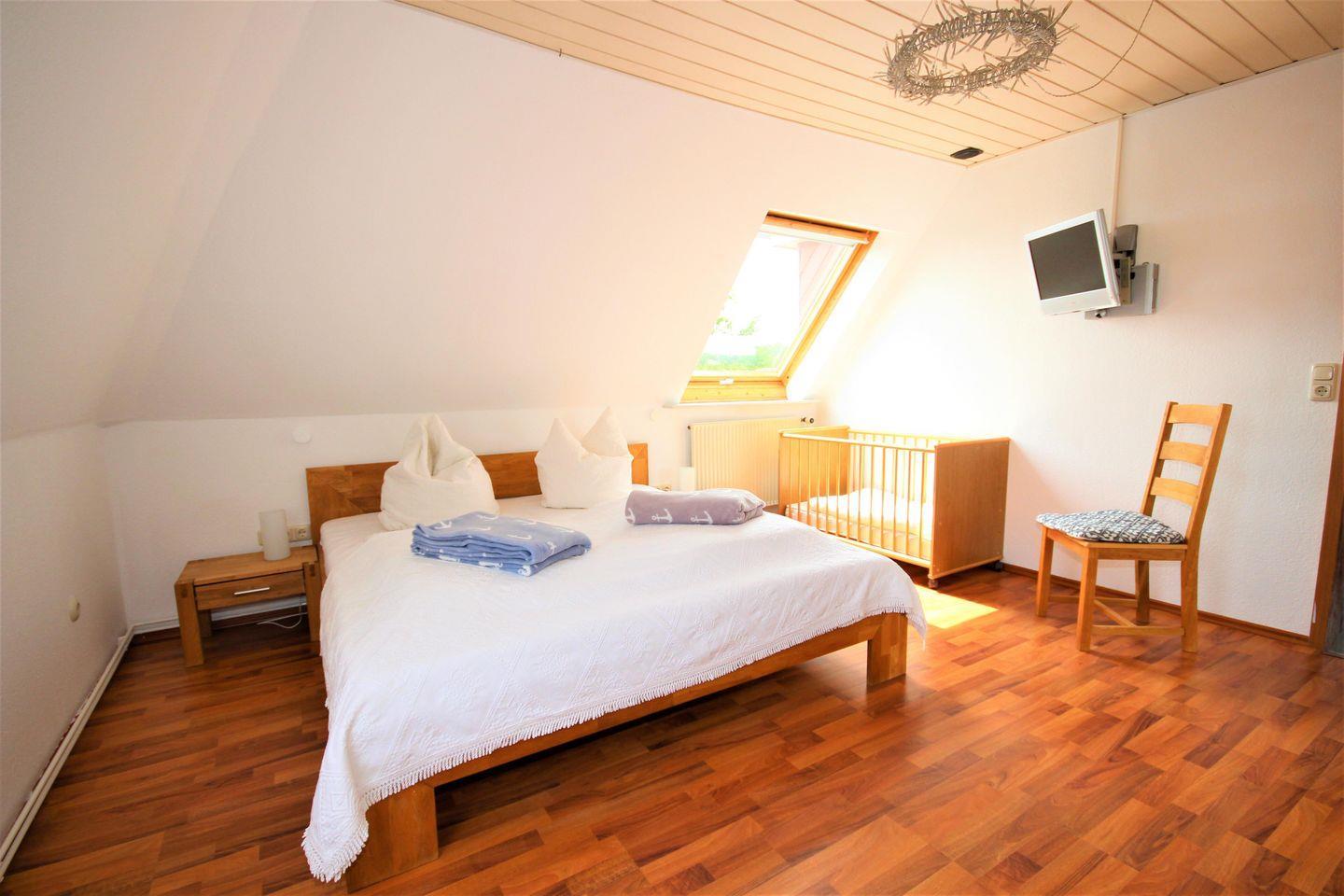 Von den 2 Schlafräumen ist eines mit einem Doppelbett ( 2 Einzelmatratzen) und das kleinere mit einem Einzelbette eingerichtet. Platz für ihre Urlaubsgarderobe gibt es ausreichend. Ein Kinderbett für kleine Gäste (bis 2 Jahre) steht kostenfrei zusätzlich bereit.