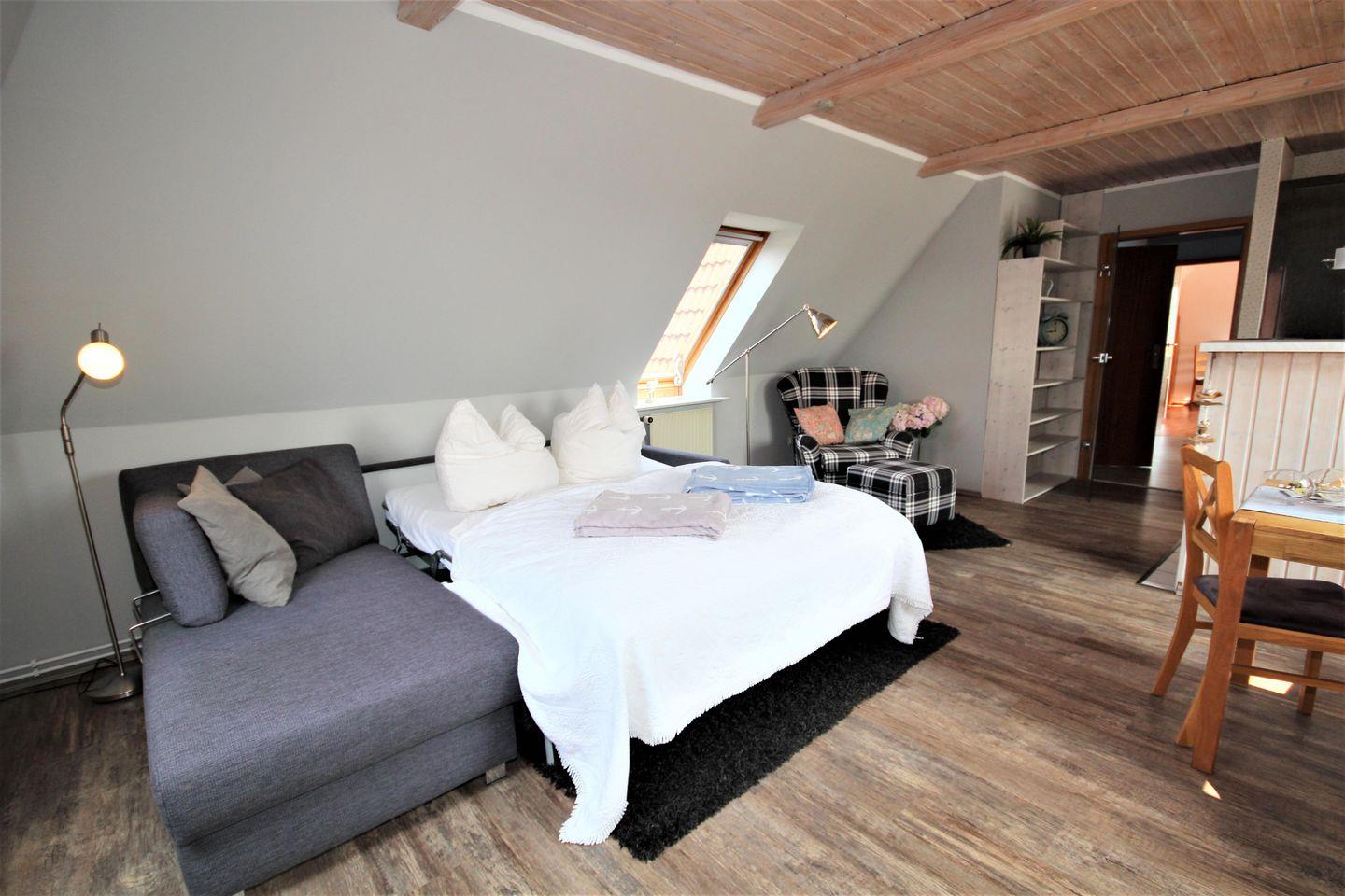 Der große, sehr geschmackvoll, eingerichtete Wohnraum- Essraum lädt zum verweilen ein, wenn das Wetter mal nicht ganz so schön ist. Ein TV- Gerät, CD- und DVD Player gehören hier zur Ausstattung. Eine Schlafcouch (Liegefläche 1,40x 1,90m) dient weiteren Personen als Schlafmöglichkeit.
