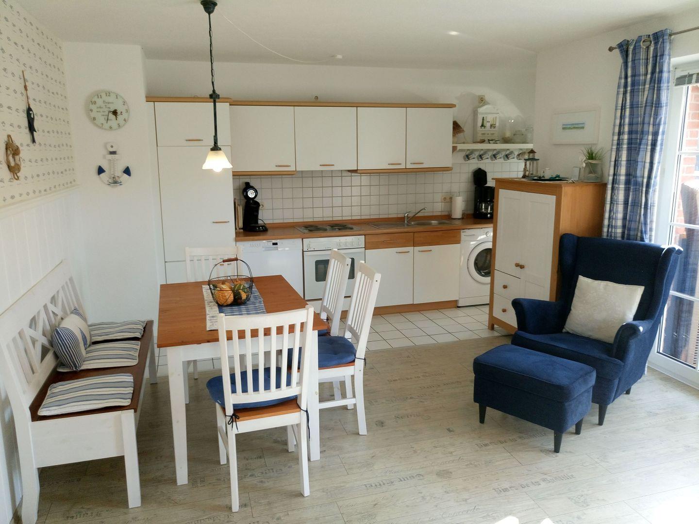 Die Küchenzeile bietet neben der üblichen Ausstattung weitere Annehmlichkeiten, wie eine Kaffeepad- Maschine, Waschmaschine und Backofen.