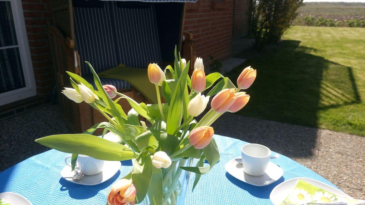 Gemütliche Ferienwohnung in Westerdeichstrich mit Terrasse und kostenfreiem Strandkorb am Deich von Mai bis September.