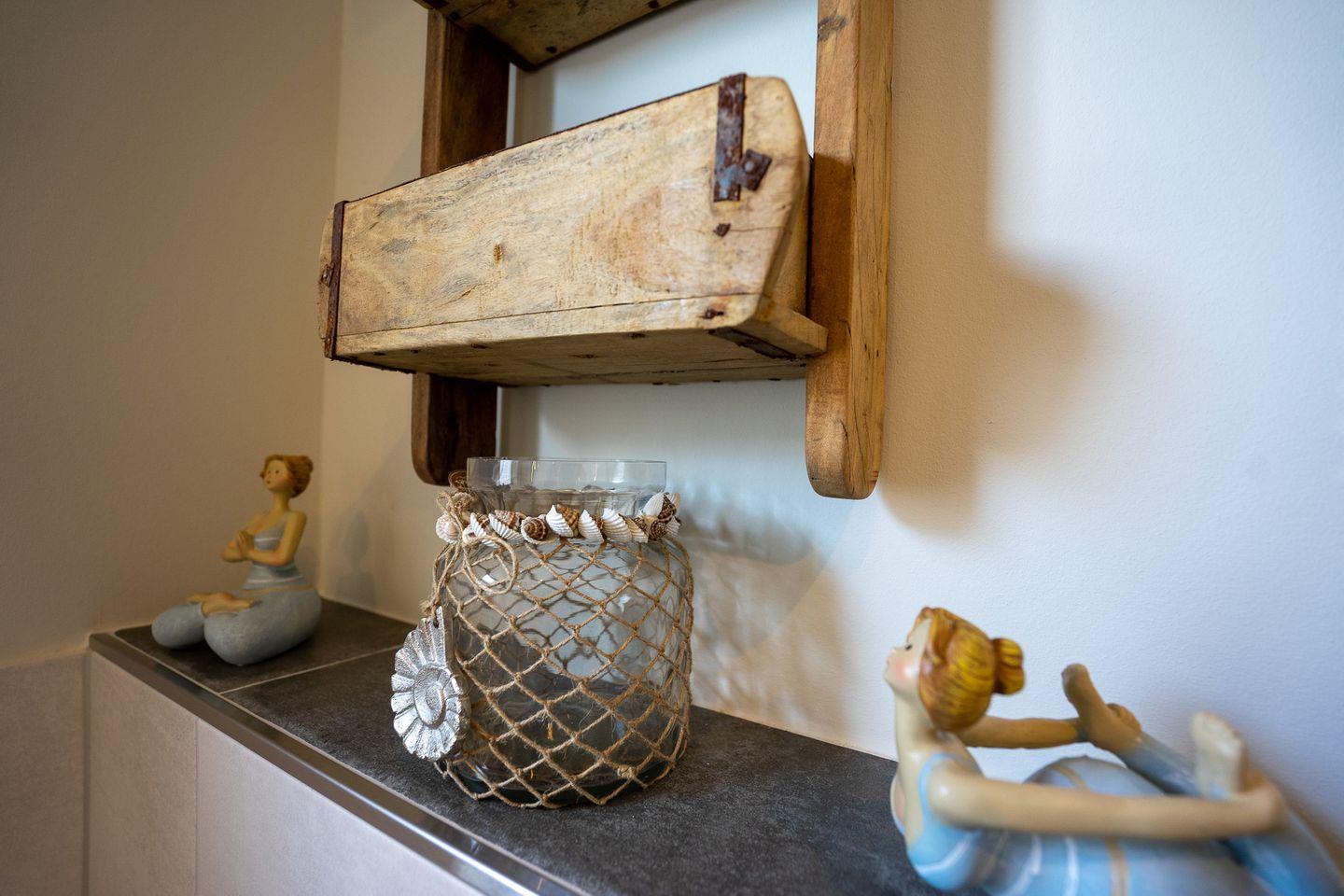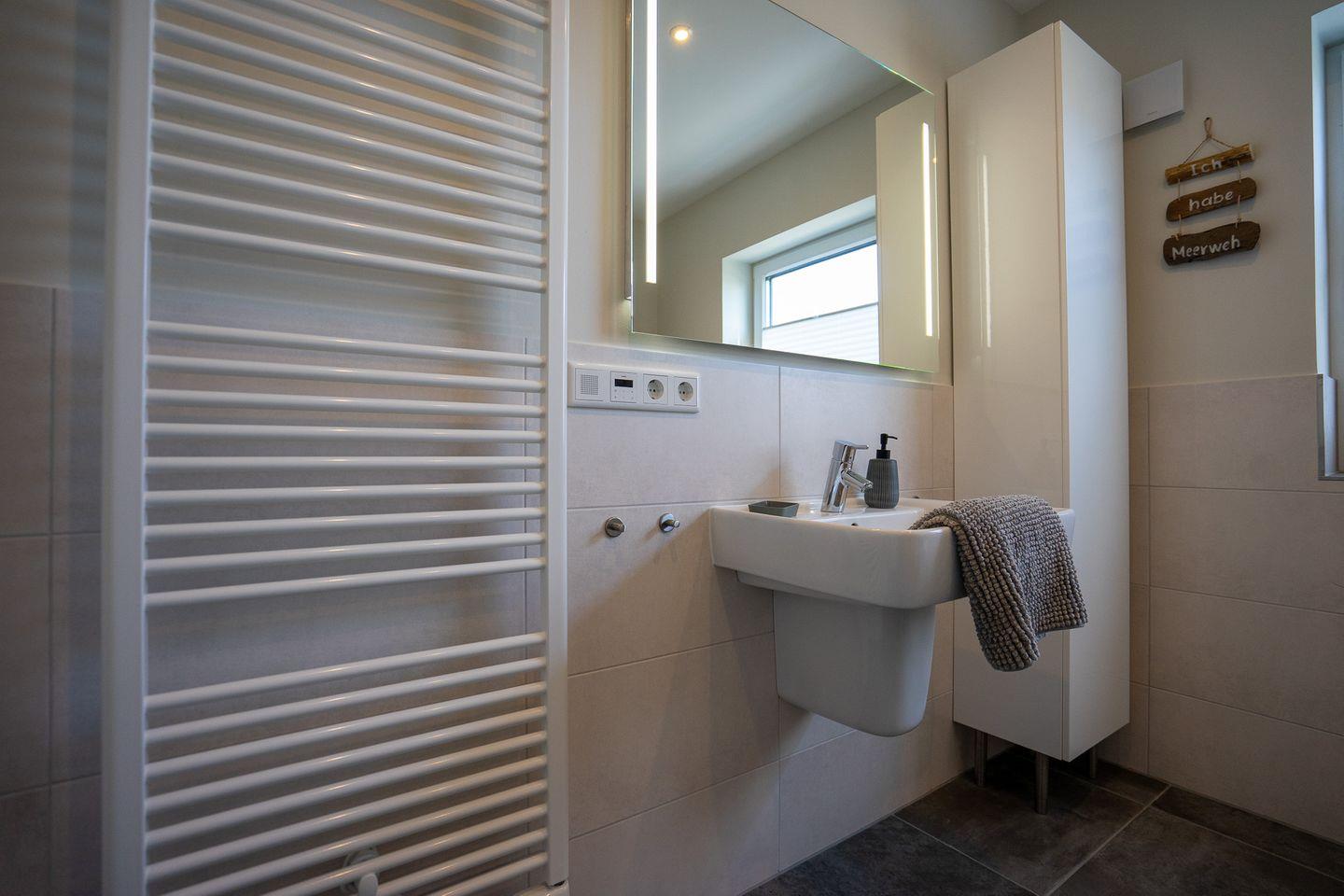 Das luxuriöse Badezimmer besticht durch große Bodenfliesen, einer ebenerdigen Regendusche, einen Handtuchheizkörper, einen beleuchteten Spiegel und ein Radio. Auch im Badezimmer lässt sich liebevoll ausgewählte Dekoration finden.