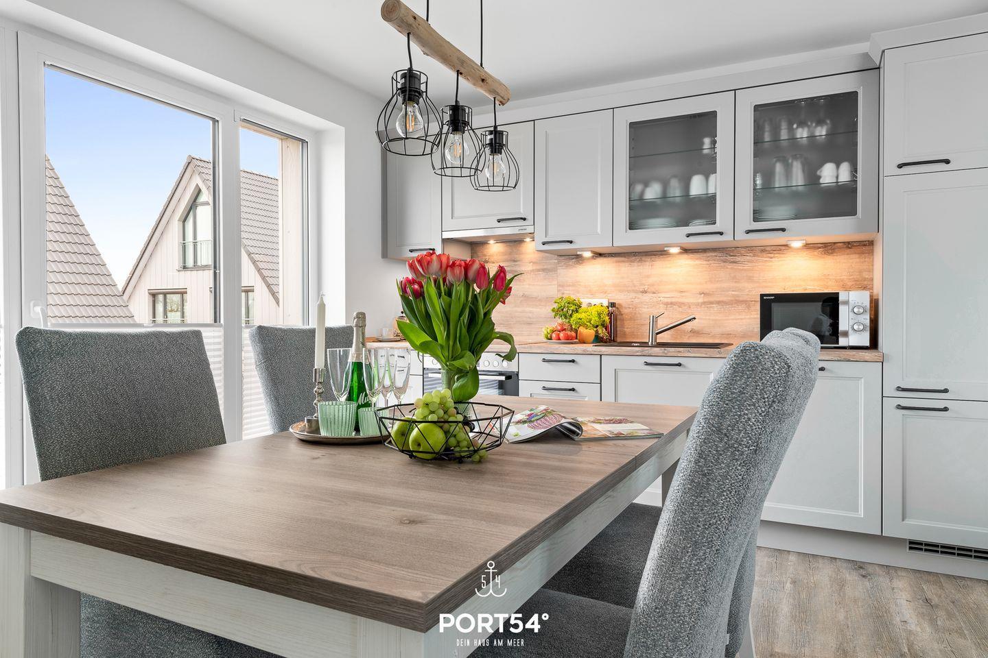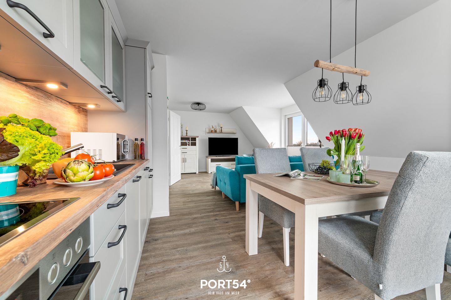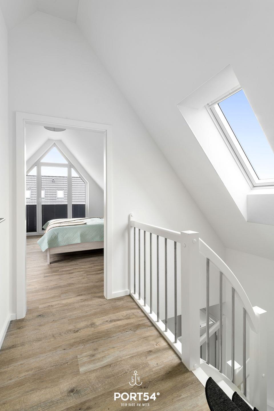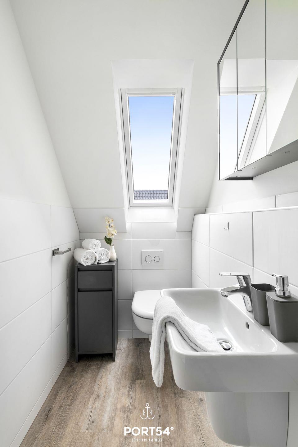 In gehobener und exklusiver Holzständerwerk-Bauweise erwartet Sie die im Dachgeschoss und Spitzboden gelegene Ferienwohnung "Küste 4" auf etwa 85m². Der lichtdurchflutete Wohnbereich ist mit einer gemütlichen Wohnlandschaft inklusive Schlaffunktion (240x135cm) und einem Flachbild-TV ausgestattet. Die angrenzende Küche ist offen gestaltet und bietet alle Annehmlichkeiten, die für einen geselligen Kochabend benötigt werden. Am Esstisch mit gemütlichen Stühlen können Sie bequem gemeinsam essen oder einen Spieleabend verbringen. Bodentiefe Fenster ermöglichen den Ausblick in die Natur. Von hier aus gelangen Sie zum vollmöblierten Balkon. In einem der beiden Schlafzimmer erwartet Sie ein großes Doppelbett (180x200cm), sowie verdunkelbare Fenster. Das andere Schlafzimmer befindet sich im ausgebauten Spitzboden und bietet ein Doppelbett (160x200cm) und einen weiteren Flachbild-TV fürs nächtliche Entertainment und Verdunkelungsmöglichkeiten für erholsame Nächte. Das Badezimmer ist mit einer ebenerdigen Dusche, einem WC sowie einem Waschbecken ausgestattet. Im Spitzboden ist ein weiteres Bad mit einem WC sowie einem Waschbecken untergebracht.