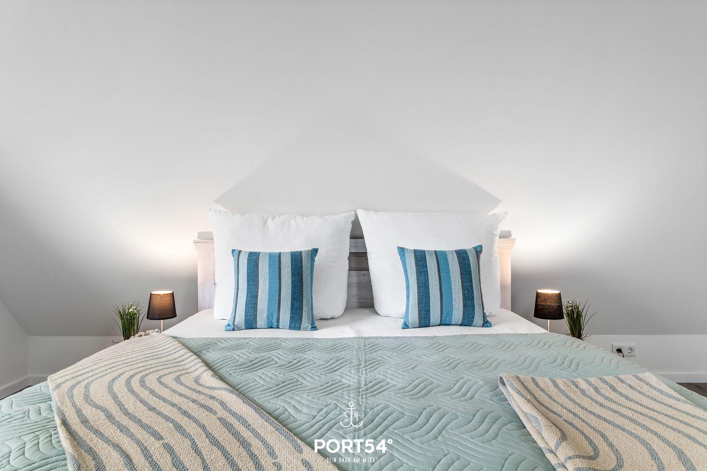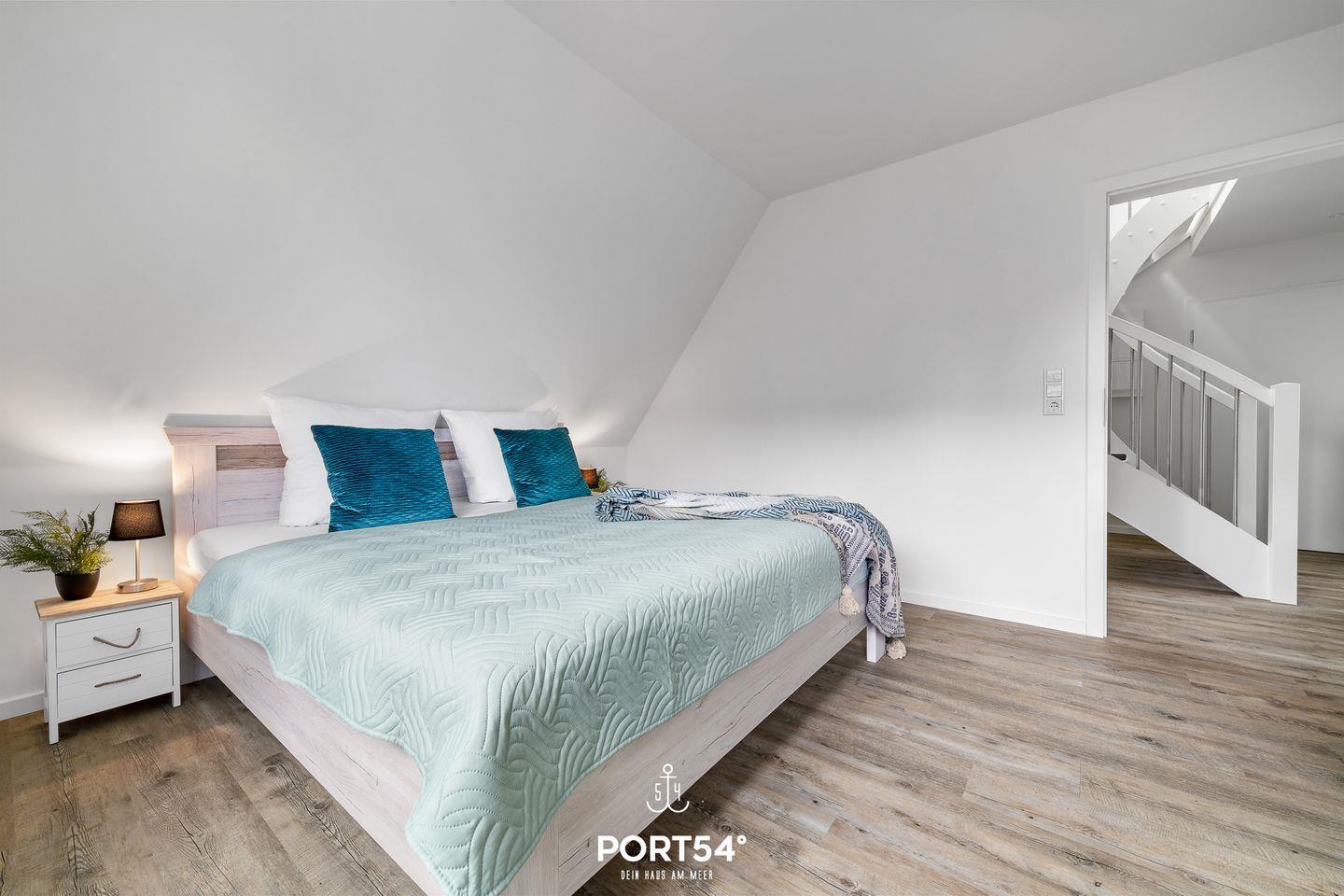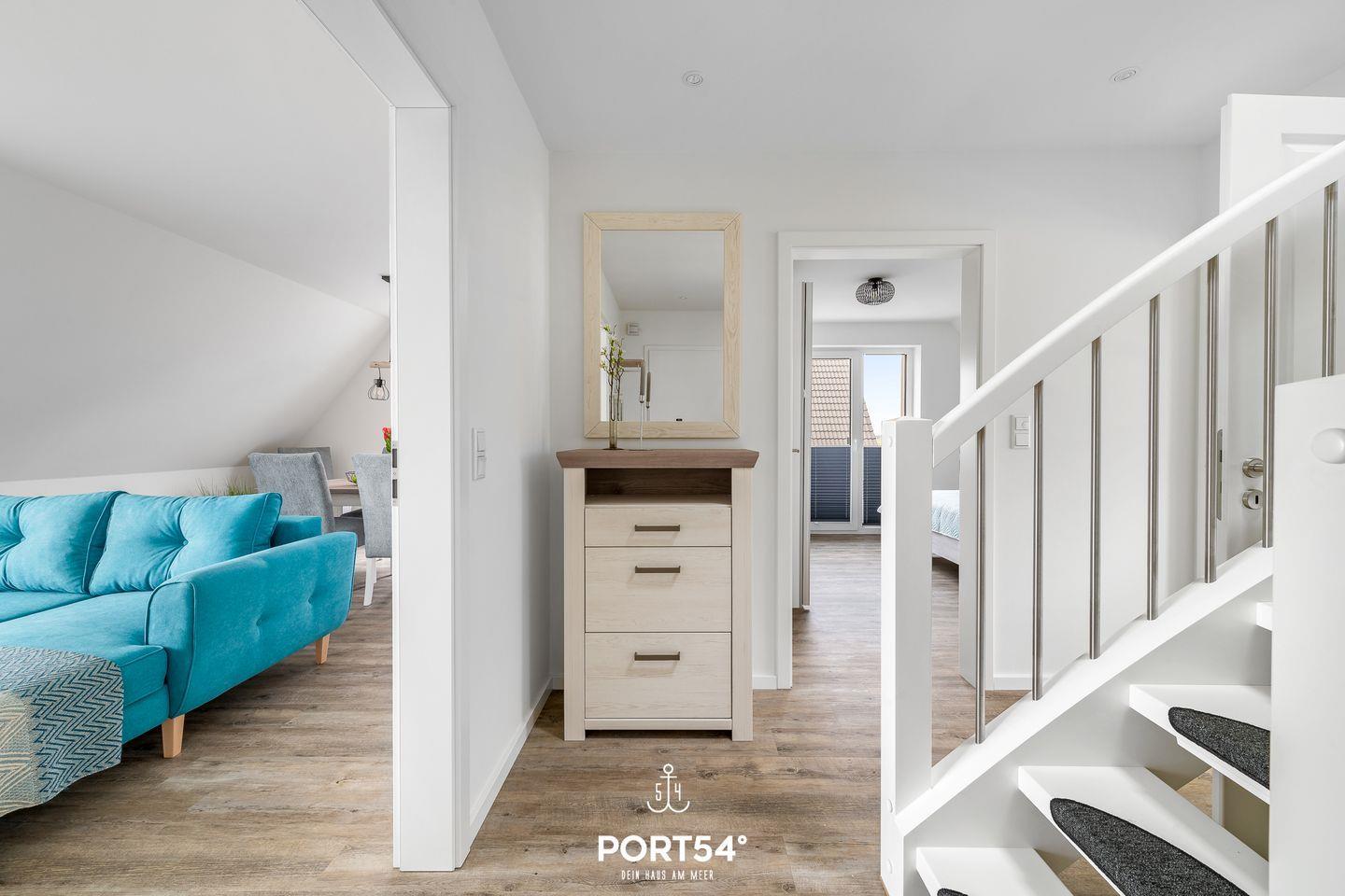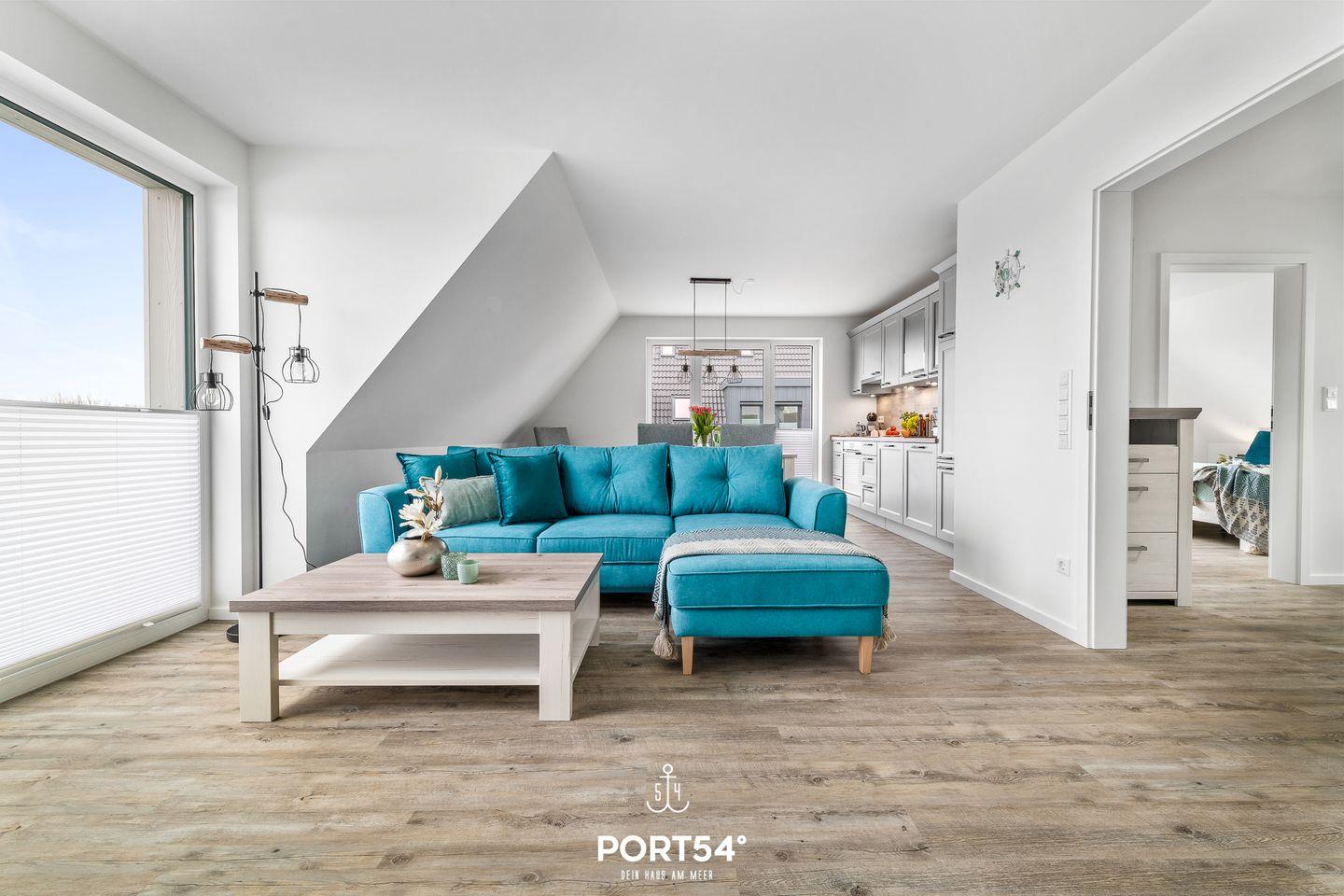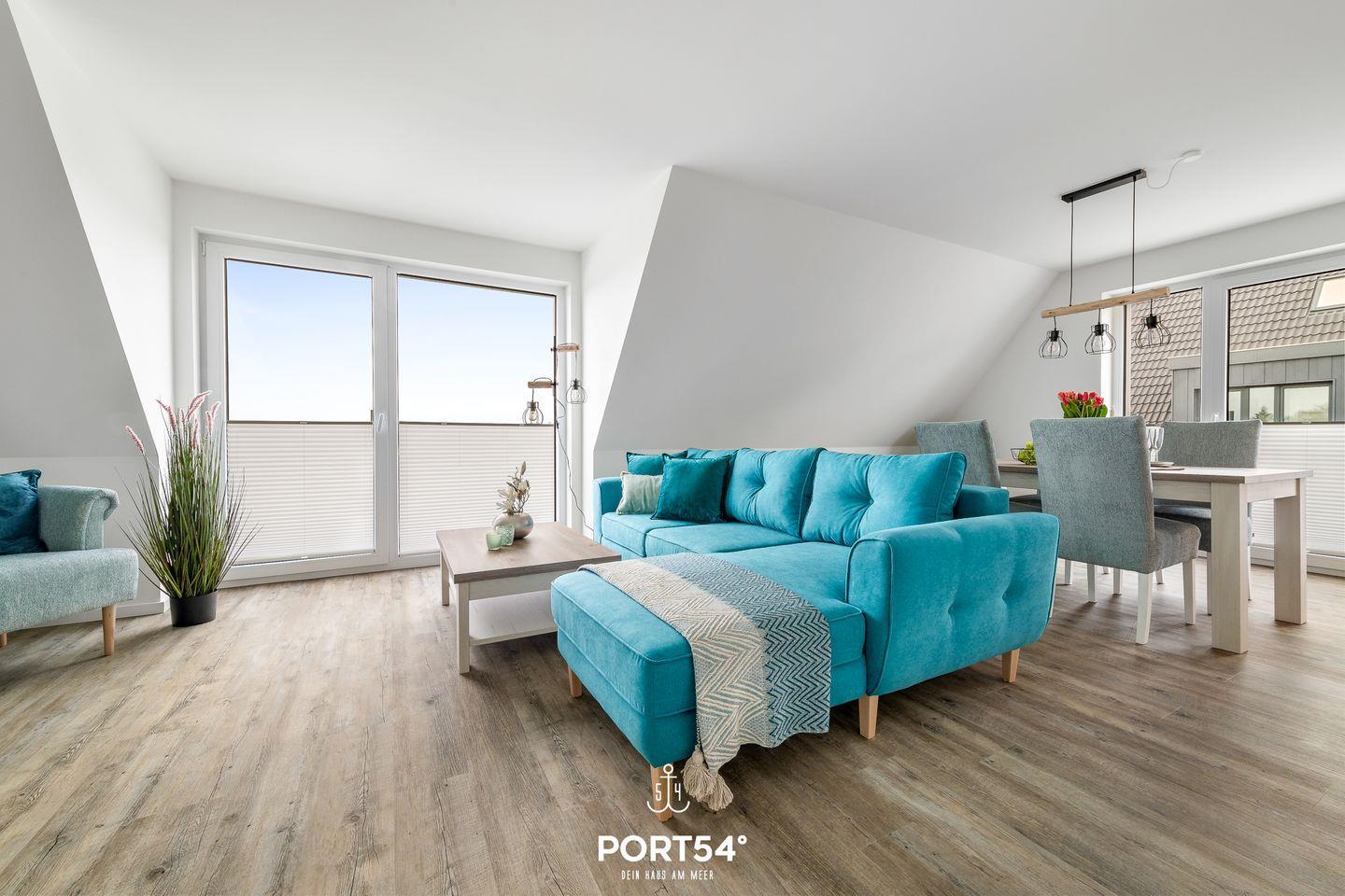 In gehobener und exklusiver Holzständerwerk-Bauweise erwartet Sie die im Dachgeschoss und Spitzboden gelegene Ferienwohnung "Küste 4" auf etwa 85m². Der lichtdurchflutete Wohnbereich ist mit einer gemütlichen Wohnlandschaft inklusive Schlaffunktion (240x135cm) und einem Flachbild-TV ausgestattet. Die angrenzende Küche ist offen gestaltet und bietet alle Annehmlichkeiten, die für einen geselligen Kochabend benötigt werden. Am Esstisch mit gemütlichen Stühlen können Sie bequem gemeinsam essen oder einen Spieleabend verbringen. Bodentiefe Fenster ermöglichen den Ausblick in die Natur. Von hier aus gelangen Sie zum vollmöblierten Balkon. In einem der beiden Schlafzimmer erwartet Sie ein großes Doppelbett (180x200cm), sowie verdunkelbare Fenster. Das andere Schlafzimmer befindet sich im ausgebauten Spitzboden und bietet ein Doppelbett (160x200cm) und einen weiteren Flachbild-TV fürs nächtliche Entertainment und Verdunkelungsmöglichkeiten für erholsame Nächte. Das Badezimmer ist mit einer ebenerdigen Dusche, einem WC sowie einem Waschbecken ausgestattet. Im Spitzboden ist ein weiteres Bad mit einem WC sowie einem Waschbecken untergebracht.