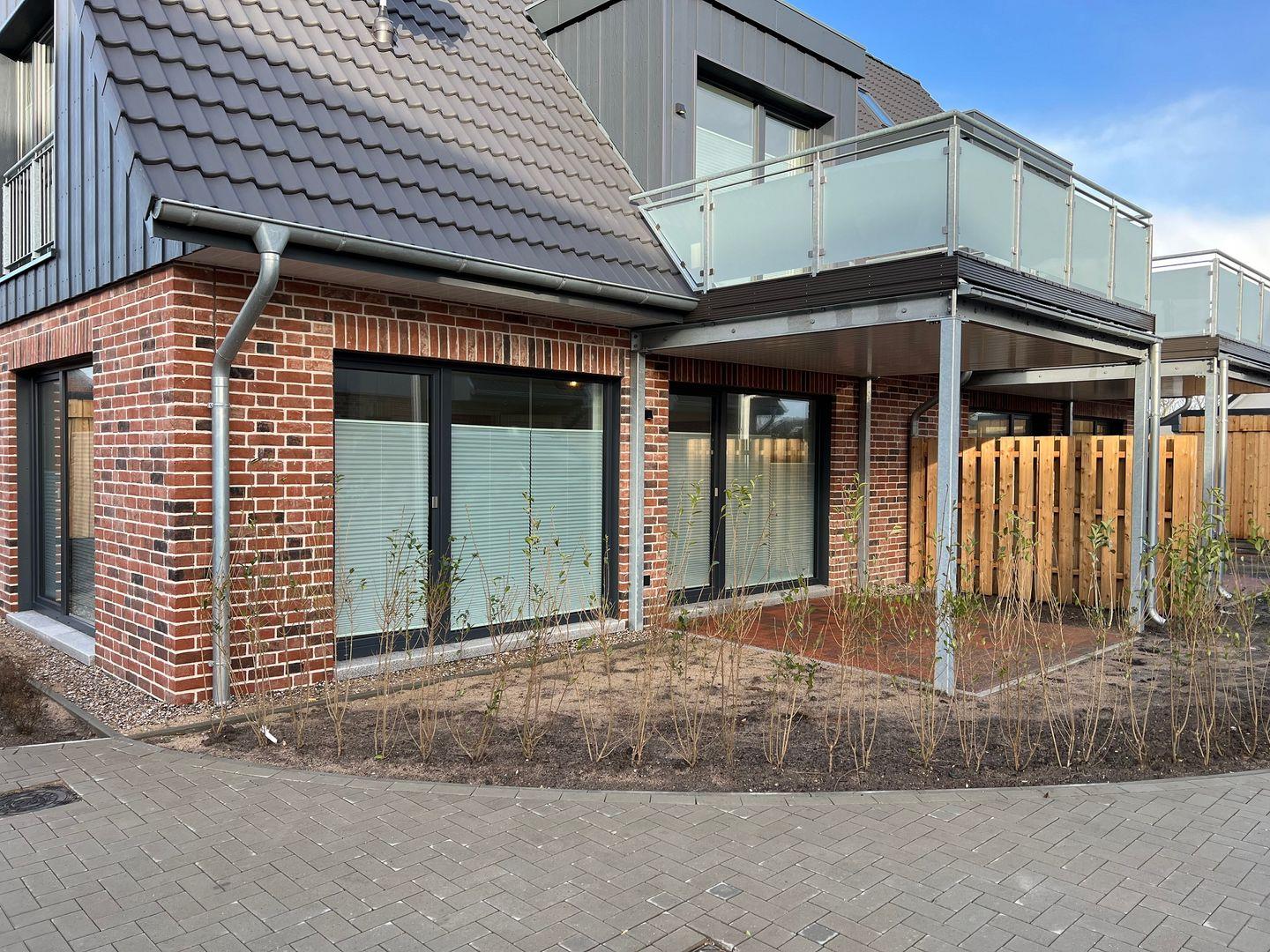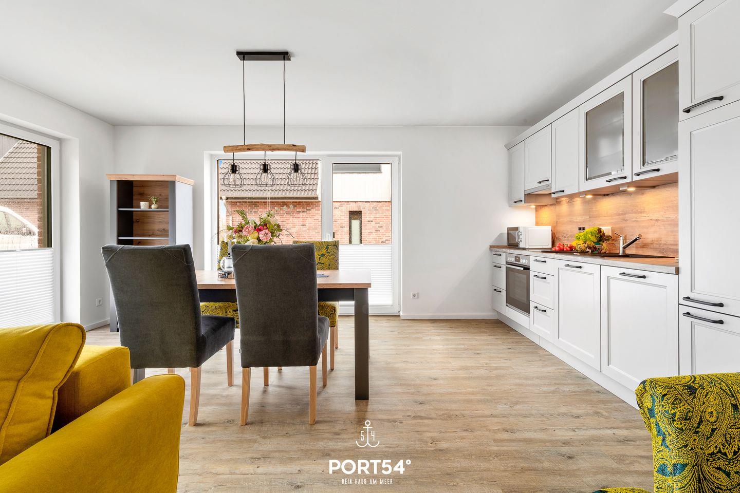 In gehobener und exklusiver Holzständerwerk-Bauweise erwartet Sie die im Erdgeschoss gelegene Ferienwohnung "Küste 5" auf etwa 64m². Der lichtdurchflutete Wohnbereich ist mit einer gemütlichen Wohnlandschaft inklusive Schlaffunktion (250x160cm) und einem Flachbild-TV ausgestattet. Die angrenzende Küche ist offen gestaltet und bietet alle Annehmlichkeiten, die für einen geselligen Kochabend benötigt werden. Am Esstisch mit gemütlichen Stühlen können Sie bequem gemeinsam essen oder einen Spieleabend verbringen. Bodentiefe Fenster lassen viel Licht herein und ermöglichen den Zutritt zur vollmöblierten Terrasse. Im Schlafzimmer erwarten Sie ein großes Doppelbett (180x200cm), sowie Verdunklungsmöglichkeiten für die Fenster. Das Badezimmer ist mit einer ebenerdigen Dusche, einem WC sowie einem Waschbecken ausgestattet. Zudem steht auch ein Fahrradschuppen für die Gäste zu Verfügung.