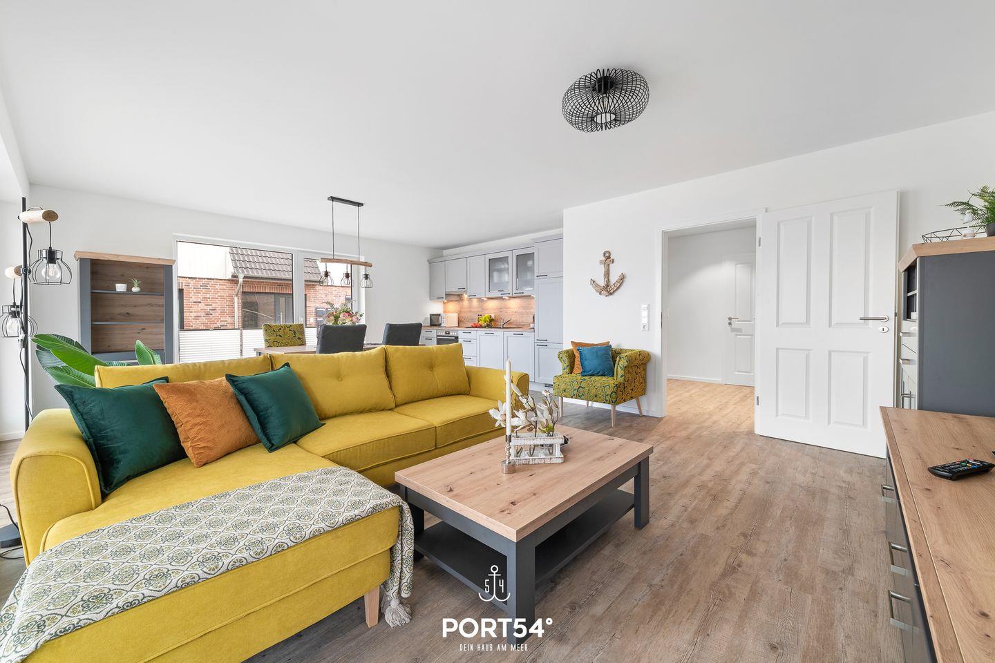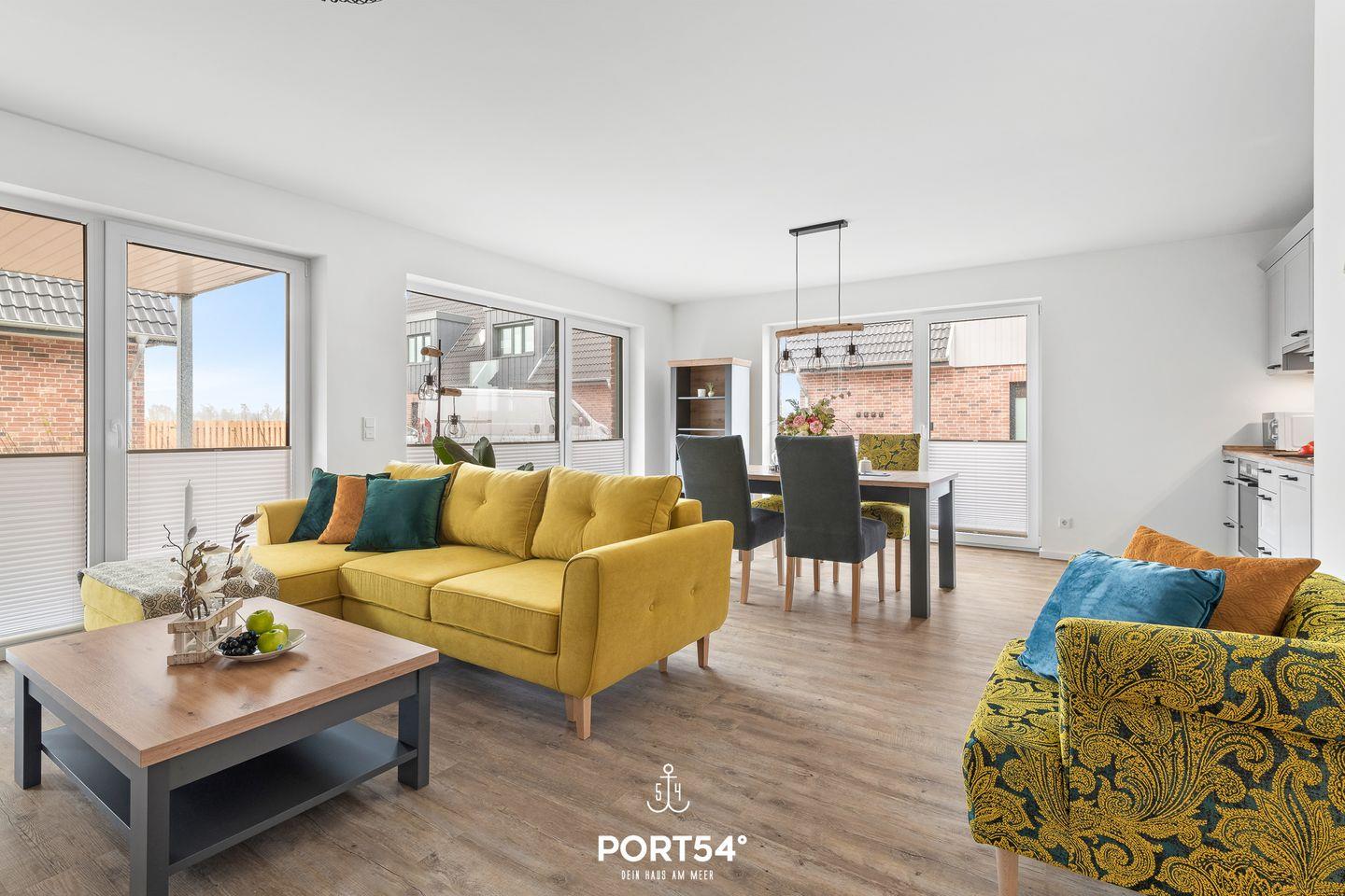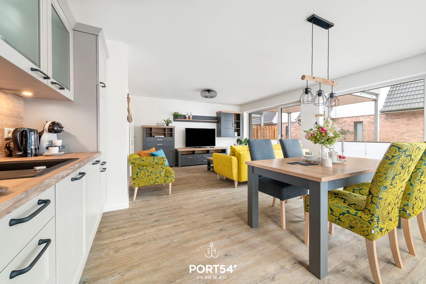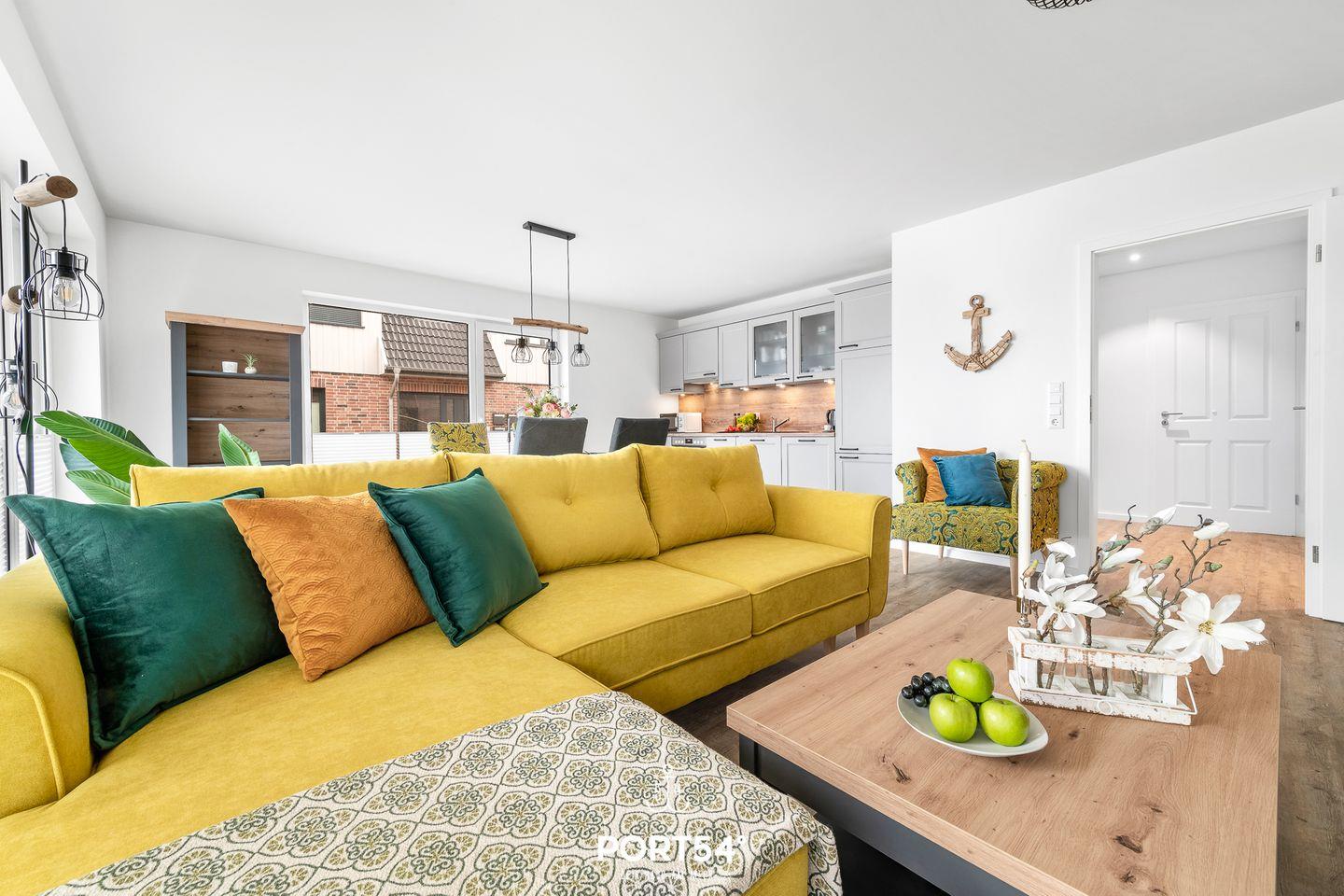 Die im EG gelegene Ferienwohnung "Küste 5" ist für 4 Personen geeignet. Der Wohnbereich verfügt über ein Schlafsofa und ein Smart-TV. Die Küche ist offen gestaltet und voll ausgestattet. Bodentiefe Fenster lassen viel Licht herein und ermöglichen den Zutritt zur vollmöblierten Terrasse. Im Schlafzimmer erwarten Sie ein großes Doppelbett (180x200cm), ein TV sowie verdunkelbare Fenster. Das Badezimmer ist mit einer ebenerdigen Dusche ausgestattet.
